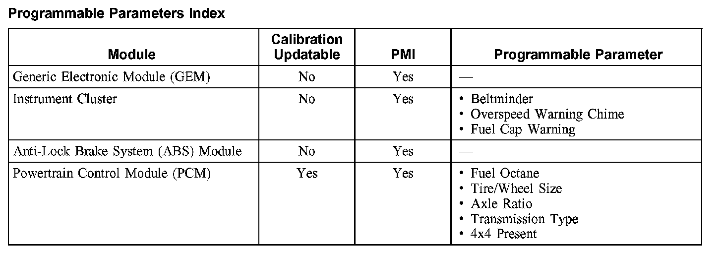 Programmable Parameters Index: