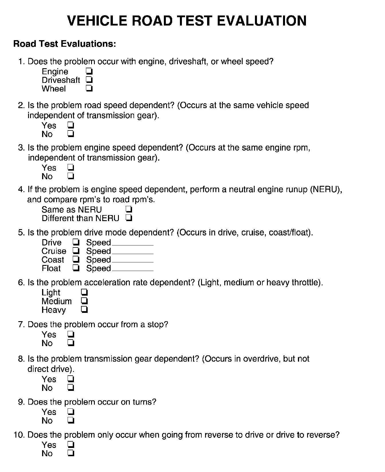 A road test is mandatory for any customer concern of noise/vibration that is not verified by the on-hoist check of chassis components. The Vehicle Road Test Evaluation form is arranged to record the conditions heard or felt during this test.