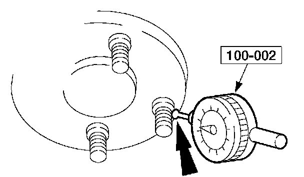 2. Rotate the hub one full turn and note the maximum and minimum readings. The difference between the maximum and minimum readings will be the total pilot runout. Pilot runout must not exceed 0.15 mm (0.006 inch).