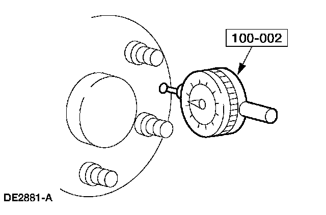 1. Position the special tool on the wheel hub face, as close to the outer edge as possible. Zero the indicator to allow the pointer to deflect either way.