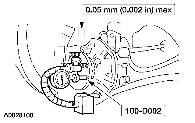 2. Rotate the hub one full turn and note the maximum and minimum readings. The difference between the maximum and minimum readings will be the total face runout. The runout must not exceed 0.254 mm (0.010 inch).