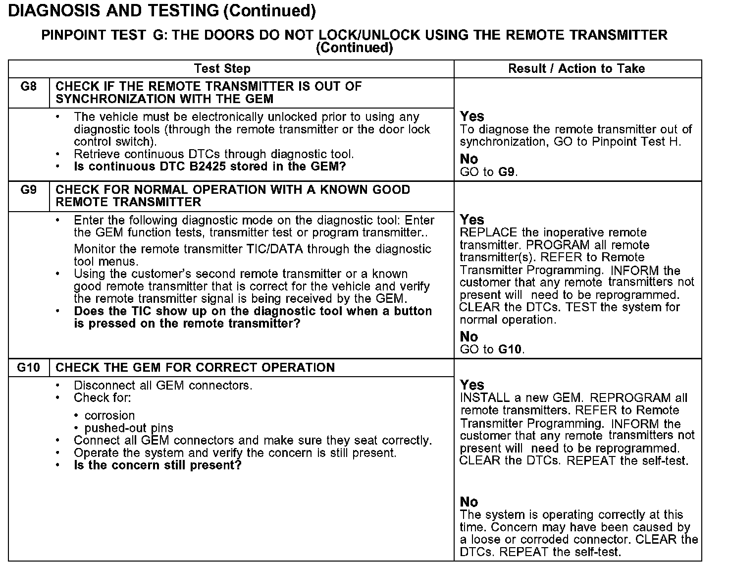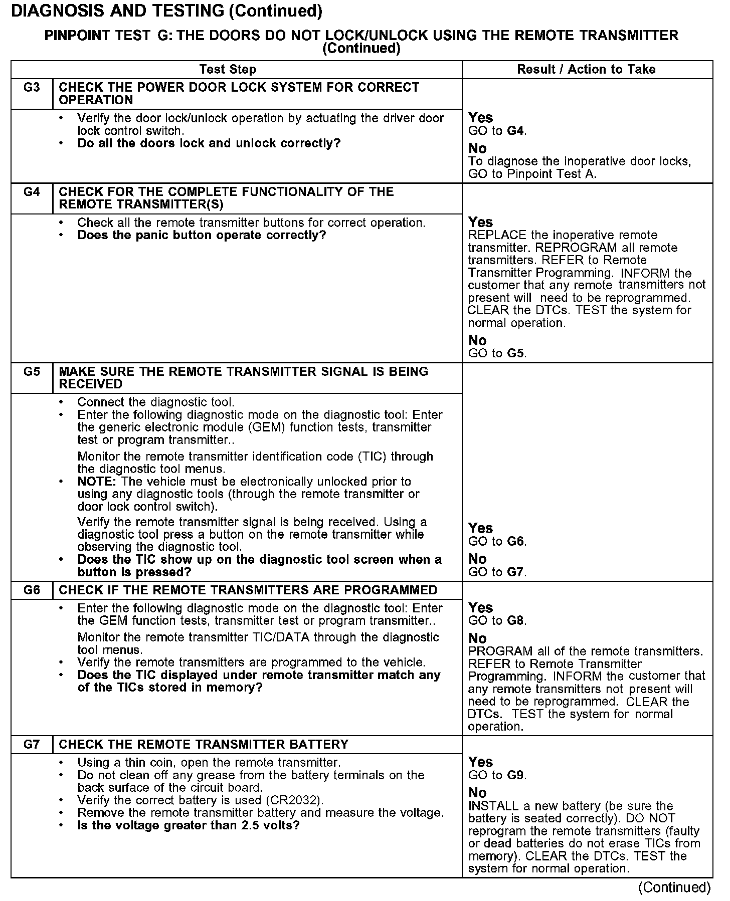 PINPOINT TEST G: THE DOORS DO NOT LOCK/UNLOCK USING THE REMOTE TRANSMITTER