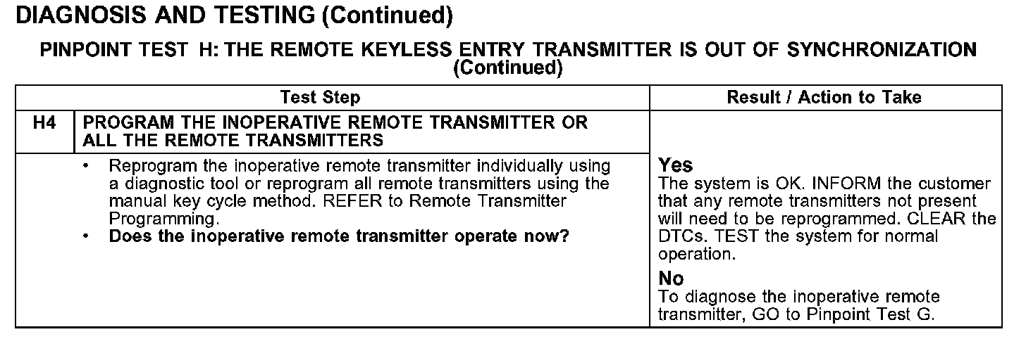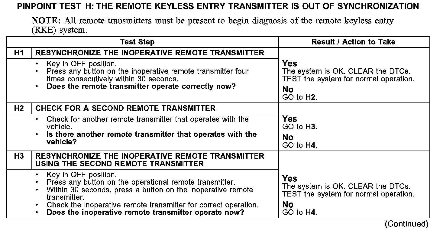 PINPOINT TEST H: THE REMOTE KEYLESS ENTRY TRANSMITTER IS OUT OF SYNCHRONIZATION