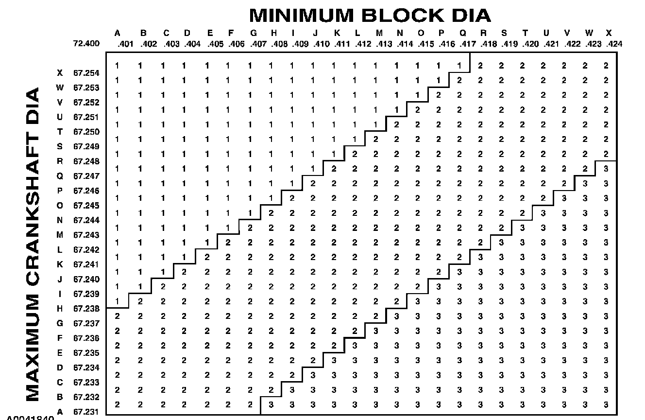 ^ Read down the column below the engine block main bearing code letter, and across the row next to the crankshaft main bearing code letter, until the two intersect. This is the required bearing grade for the number one crankshaft main bearing.