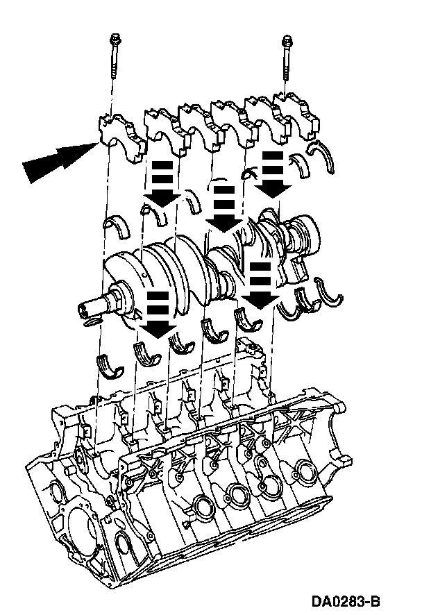 10. Install the No. 1 through No. 5 crankshaft lower main bearings into the main bearing caps. Locate the main bearing caps on the cylinder block and, keeping the cap as square as possible, alternately draw the cap down evenly using the cap fasteners.