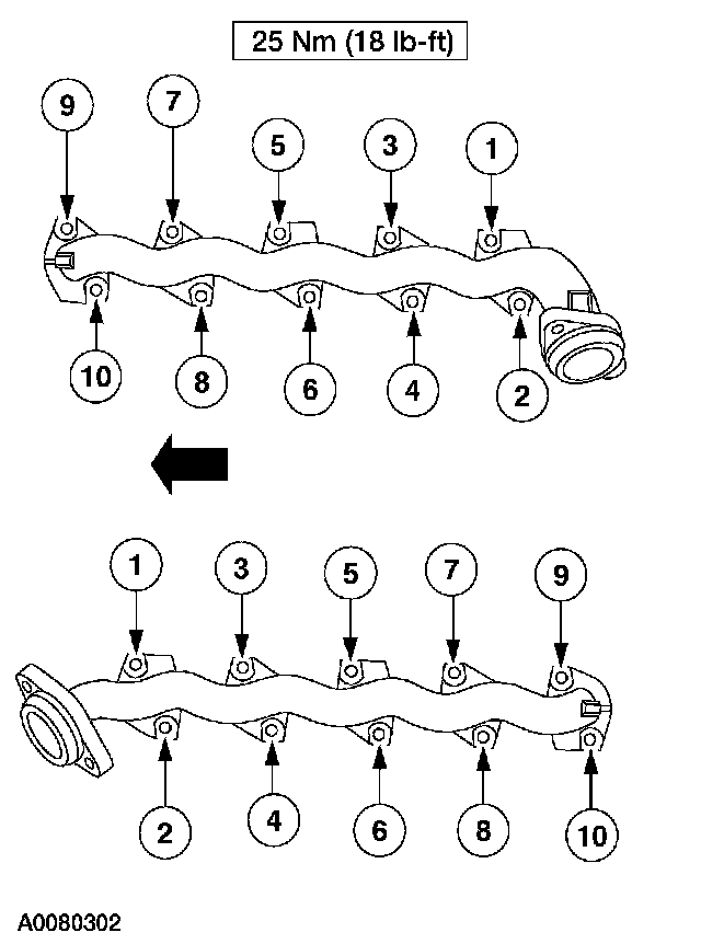 30. Install the left and right exhaust manifold gaskets and exhaust manifolds. Loosely Install the nuts. Tighten the nuts in the sequence shown.