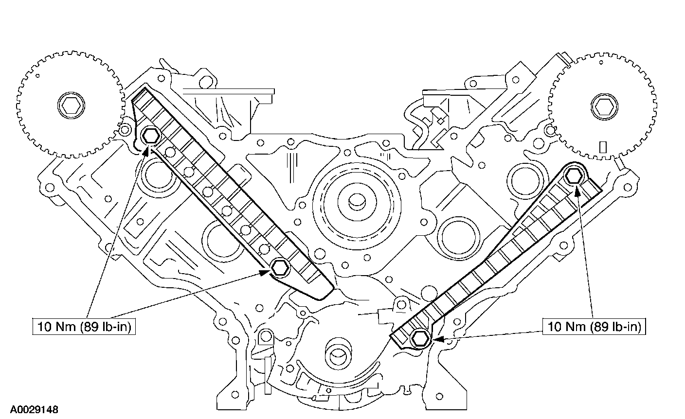45. NOTE: The LH timing chain tensioner arm has a bump near the dowel hole for identification.