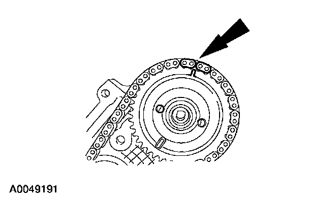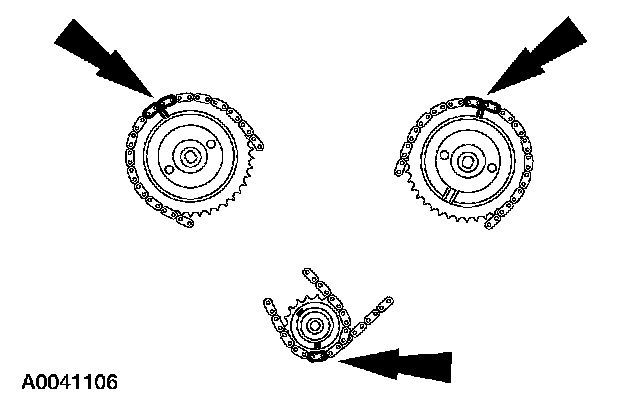 Position the timing chain on the LH camshaft sprocket with the two copper (marked) chain links and the camshaft sprocket timing mark aligned.