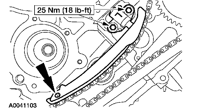 41. NOTE: Make sure the upper half of the timing chain is below the tensioner guide dowel.