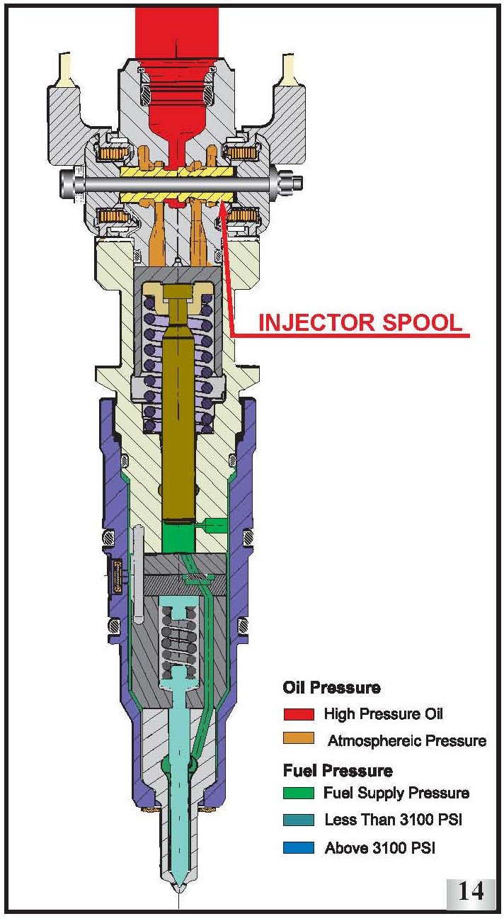 In these cases, the FICM is working as intended, but movement of the spool in the upper portion of the injector is limited due to sludge build-up on the ends of the spool.