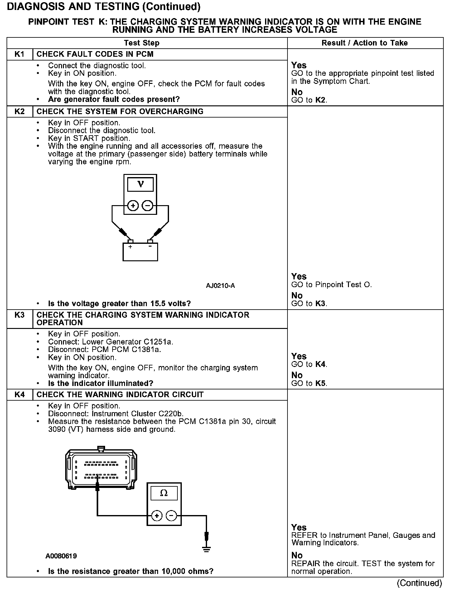 WARNING INDICATOR IS ON WITH THE ENGINE RUNNING AND THE BATTERY INCREASES VOLTAGE