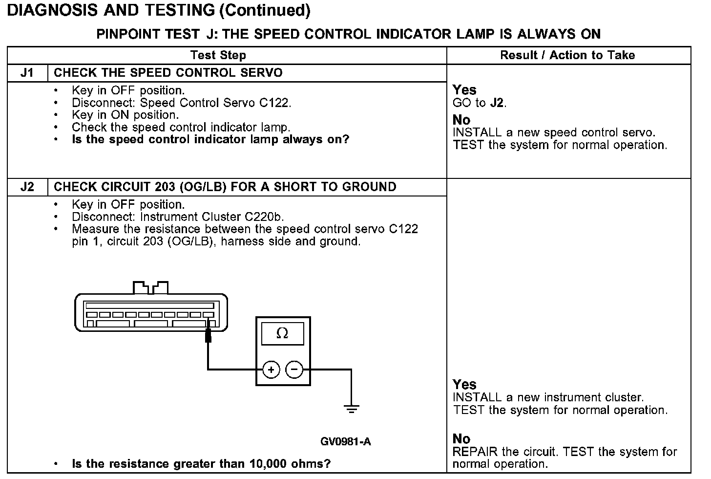 PINPOINT TEST J: THE SPEED CONTROL INDICATOR LAMP IS ALWAYS ON