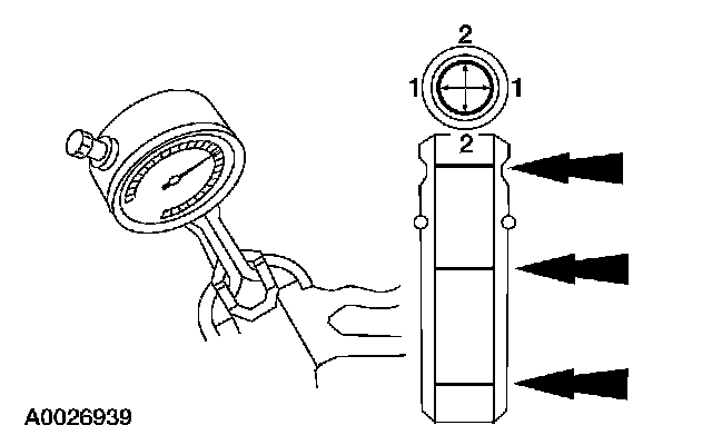 1. Measure the inner diameter of the valve guides in two directions where indicated.