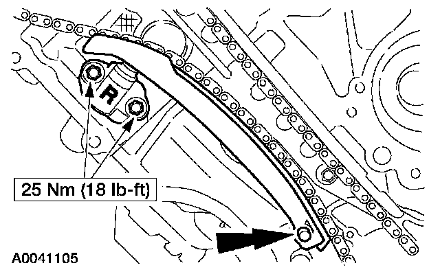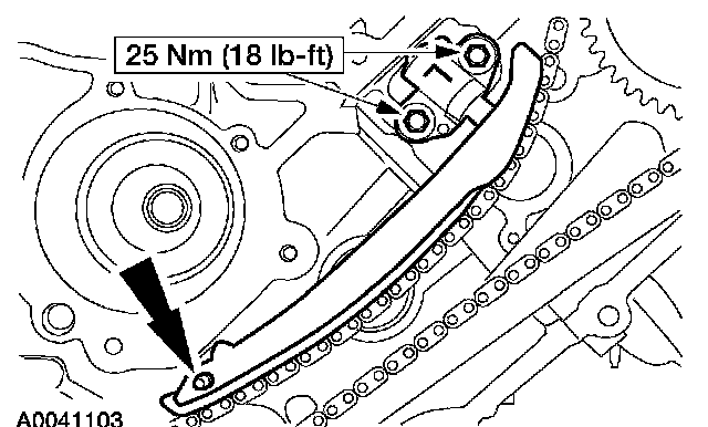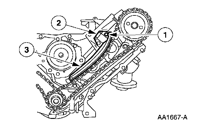 15. NOTE: The lower half of the timing chain must be positioned above the tensioner arm dowel.