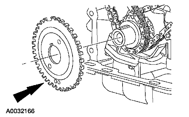 Position the timing chain on the camshaft sprocket with the camshaft sprocket timing mark positioned between the two copper (marked) chain links.