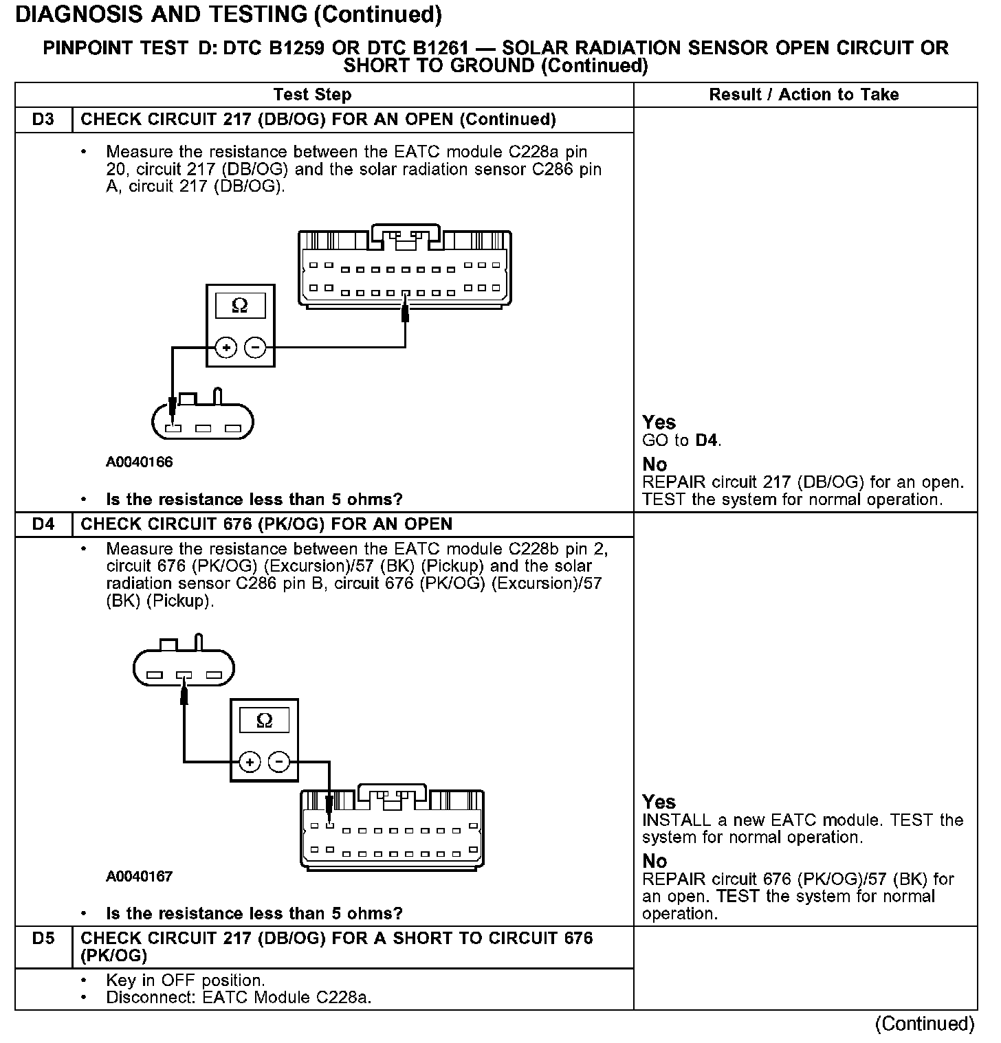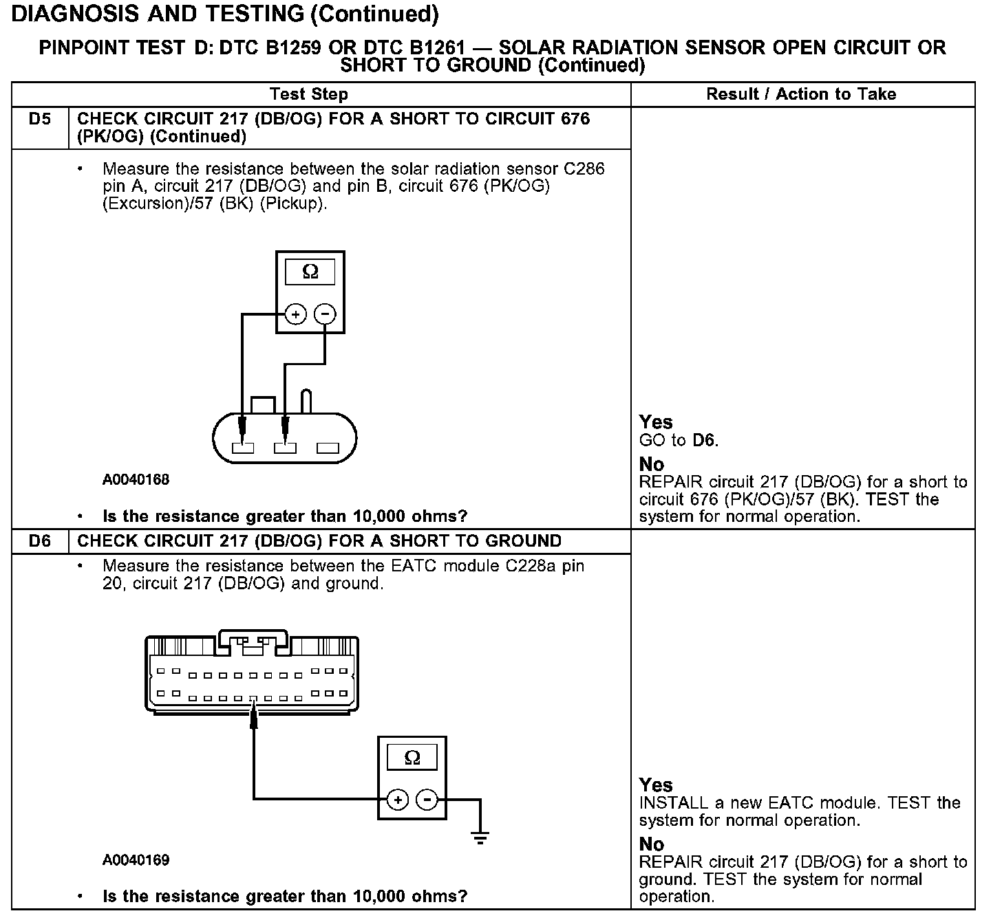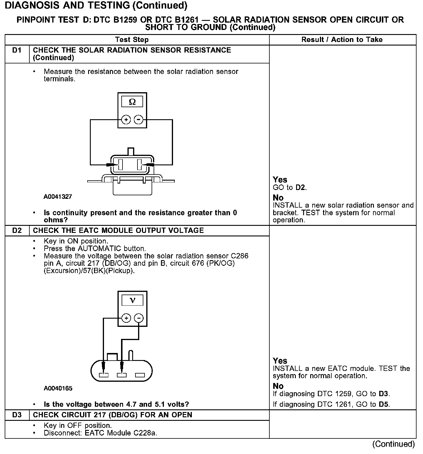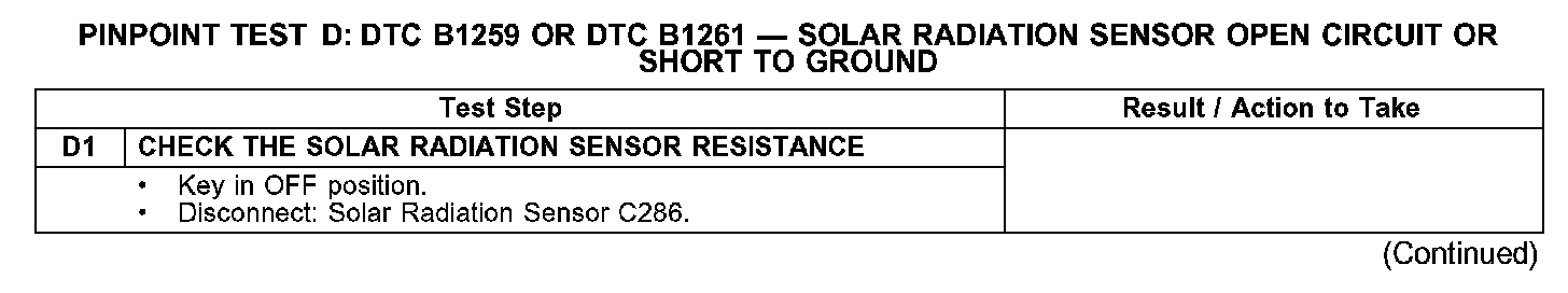 PINPOINT TEST D: DTC B1259 OR DTC B1261 - SOLAR RADIATION SENSOR OPEN CIRCUIT OR SHORT TO GROUND