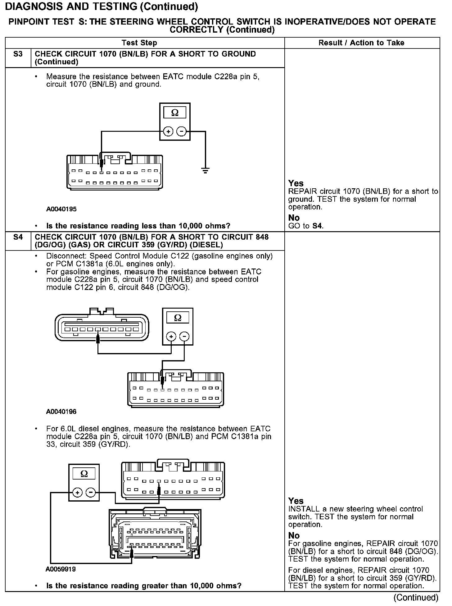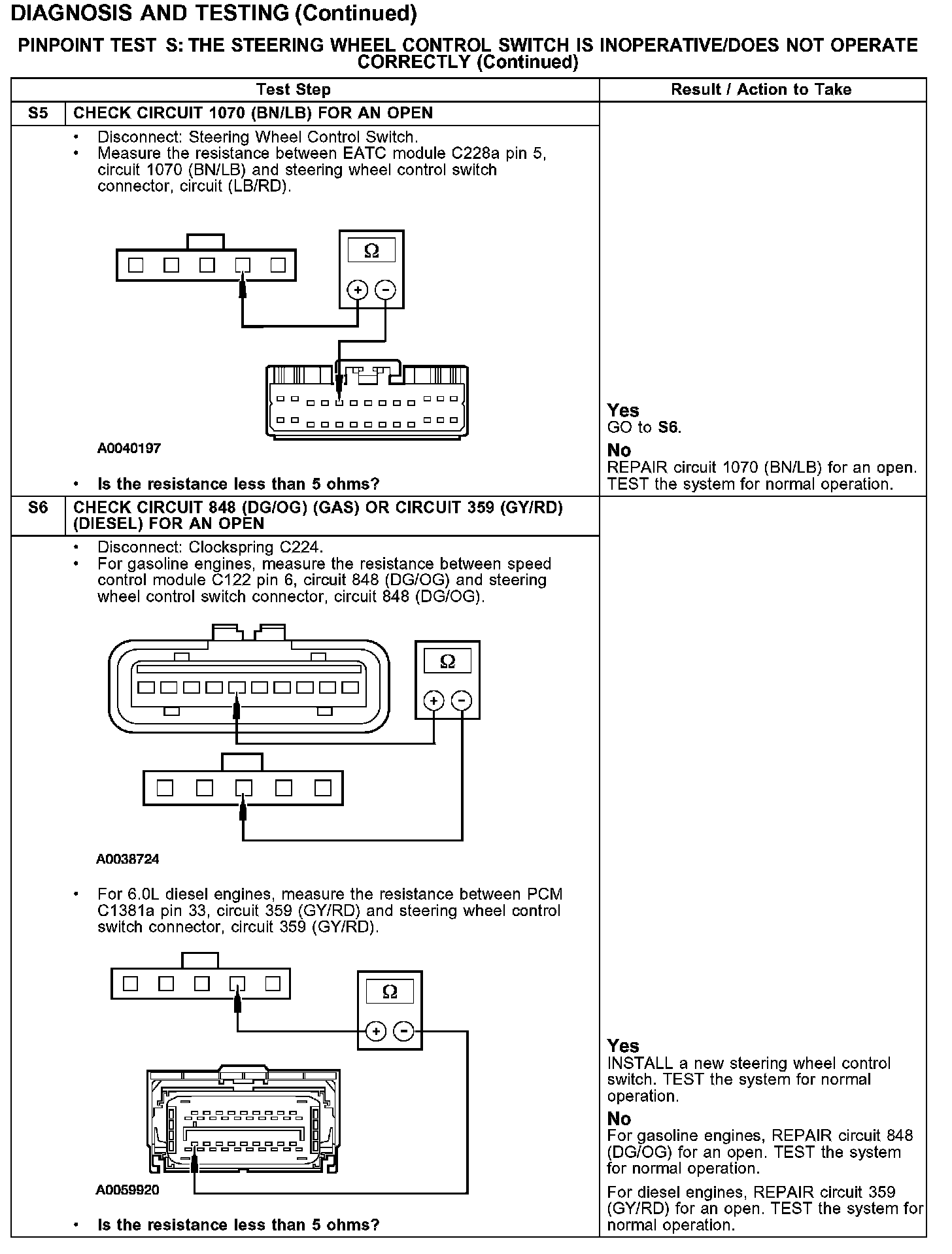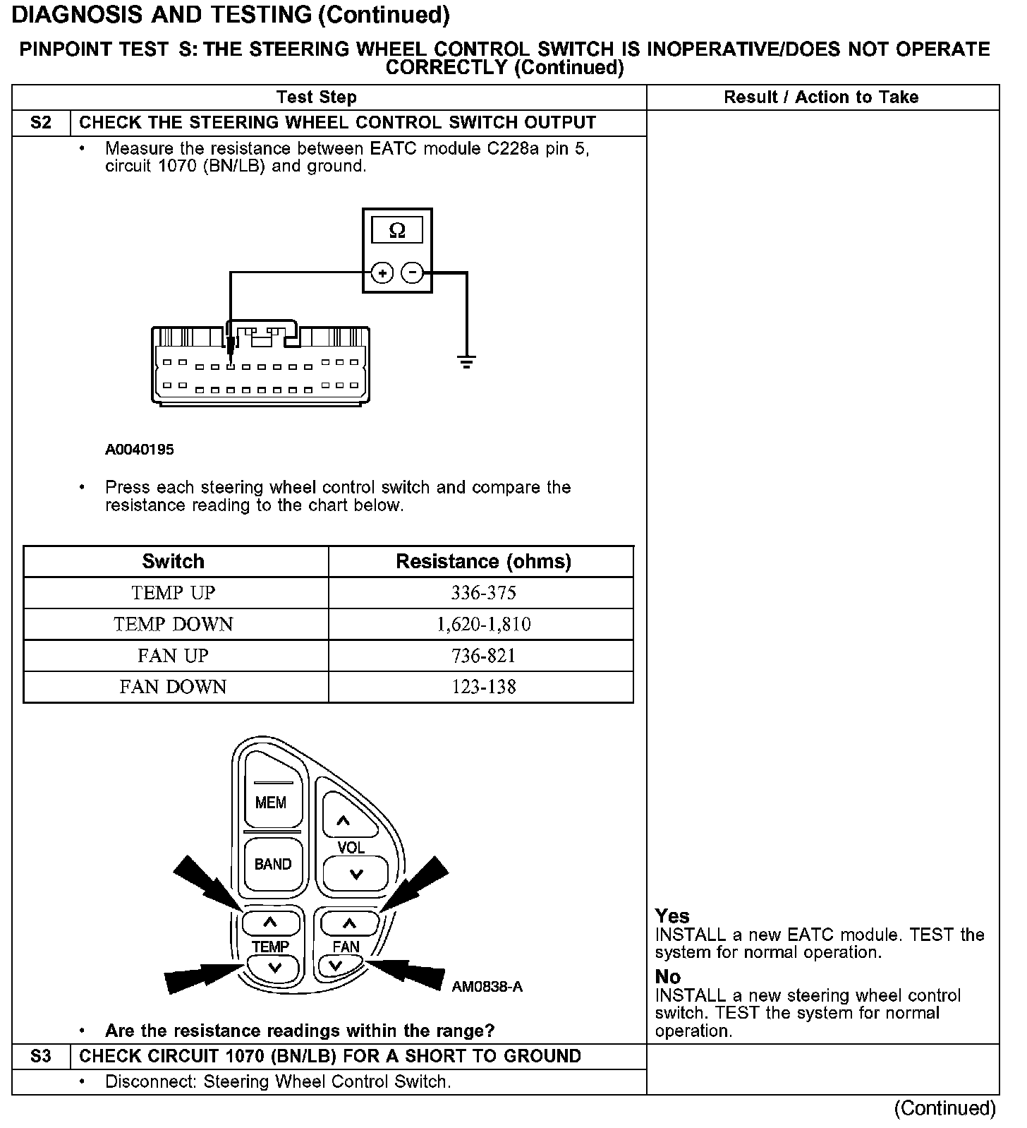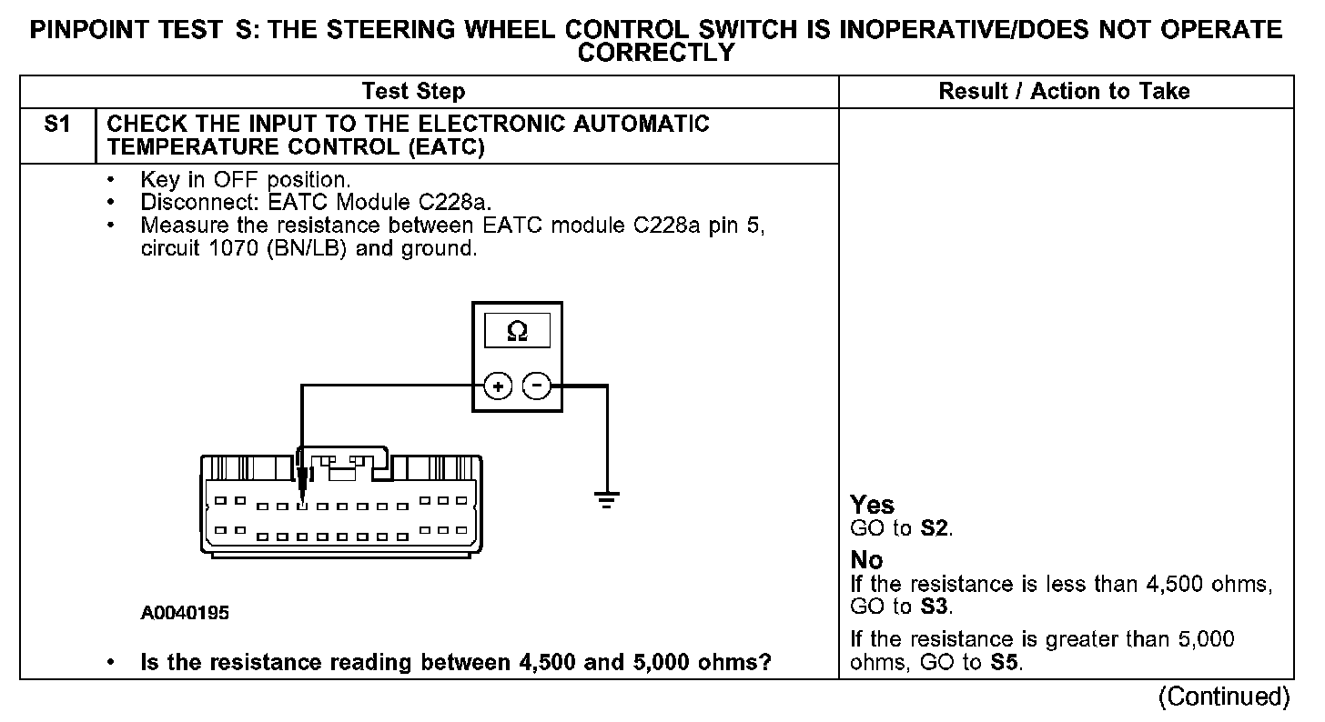 PINPOINT TEST S: THE STEERING WHEEL CONTROL SWITCH IS INOPERATIVE/DOES NOT OPERATE CORRECTLY