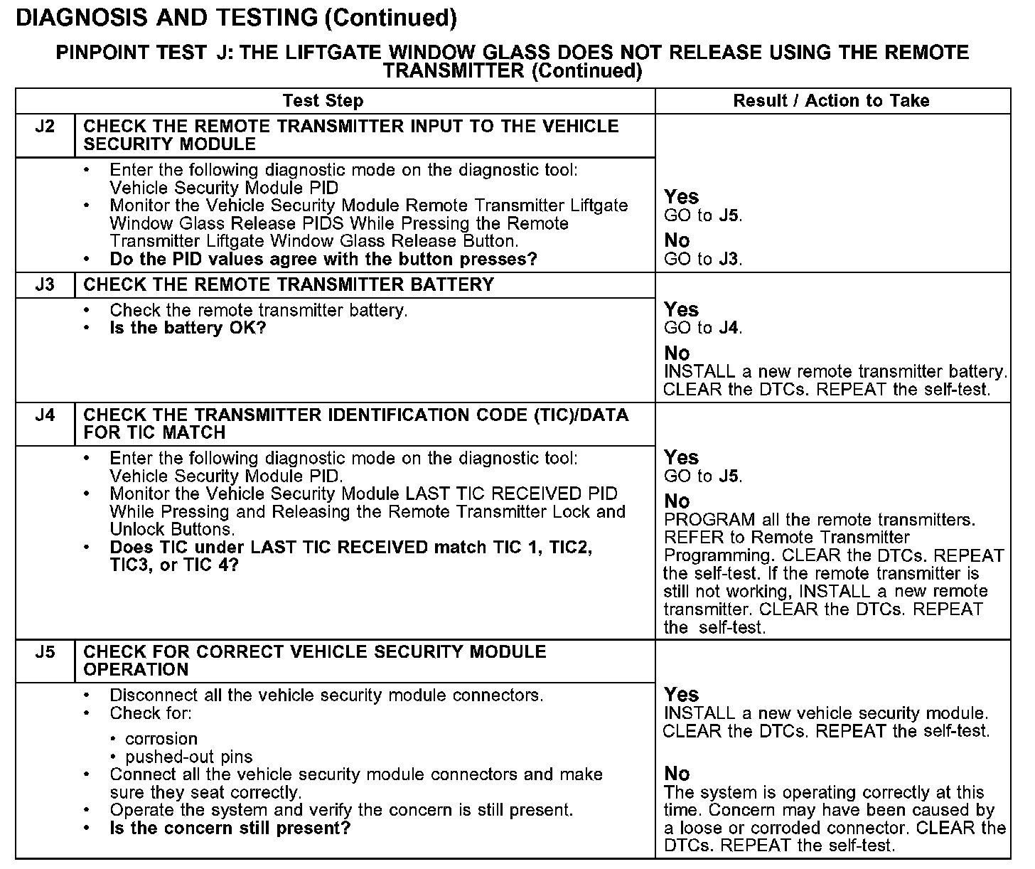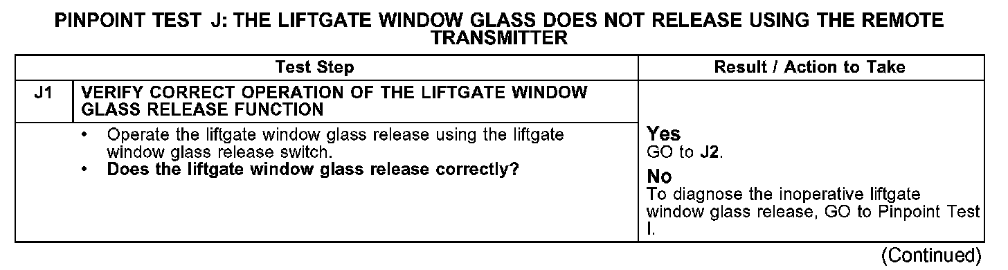 PINPOINT TEST J: THE LIFTGATE WINDOW GLASS DOES NOT RELEASE USING THE REMOTE TRANSMITTERTest J1: