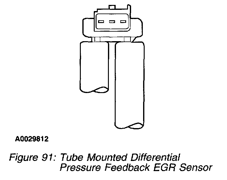 The tube mounted differential pressure feedback EGR sensor (Figure 91) is identical in operation as the larger metal or plastic DPFE sensors and uses a 1.0 volt offset. The HI and REF hose connections are marked on the underside of the sensor.