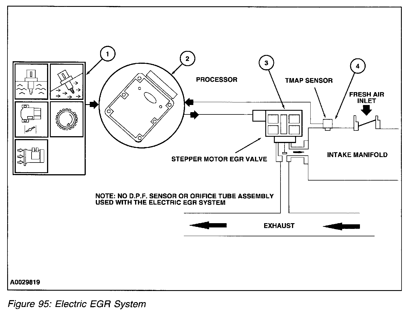 The EEGR system consists of an electric motor/EGR valve integrated assembly, a PCM, and connecting wiring. Additionally a MAP sensor is also required. Operation of the system is as follows (Figure 95):