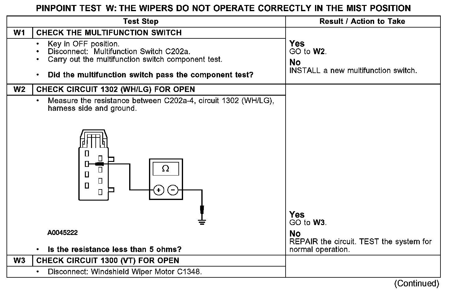 Under normal operation the multifunction switch receives ground through 1302 (WH/LG). The front wiper motor receives input from the multifunction switch through circuit 1300 (VT) to operate the MIST wiper function.