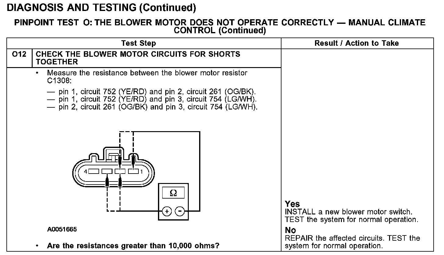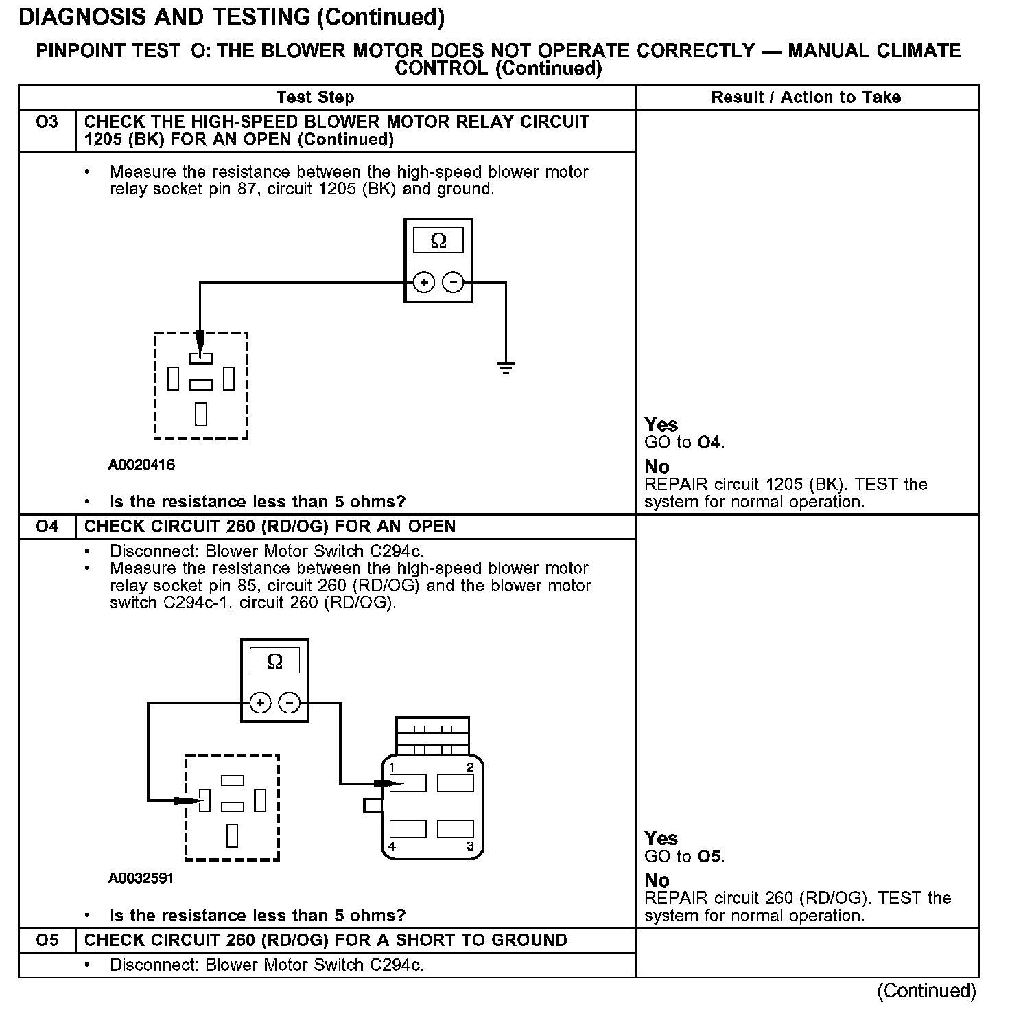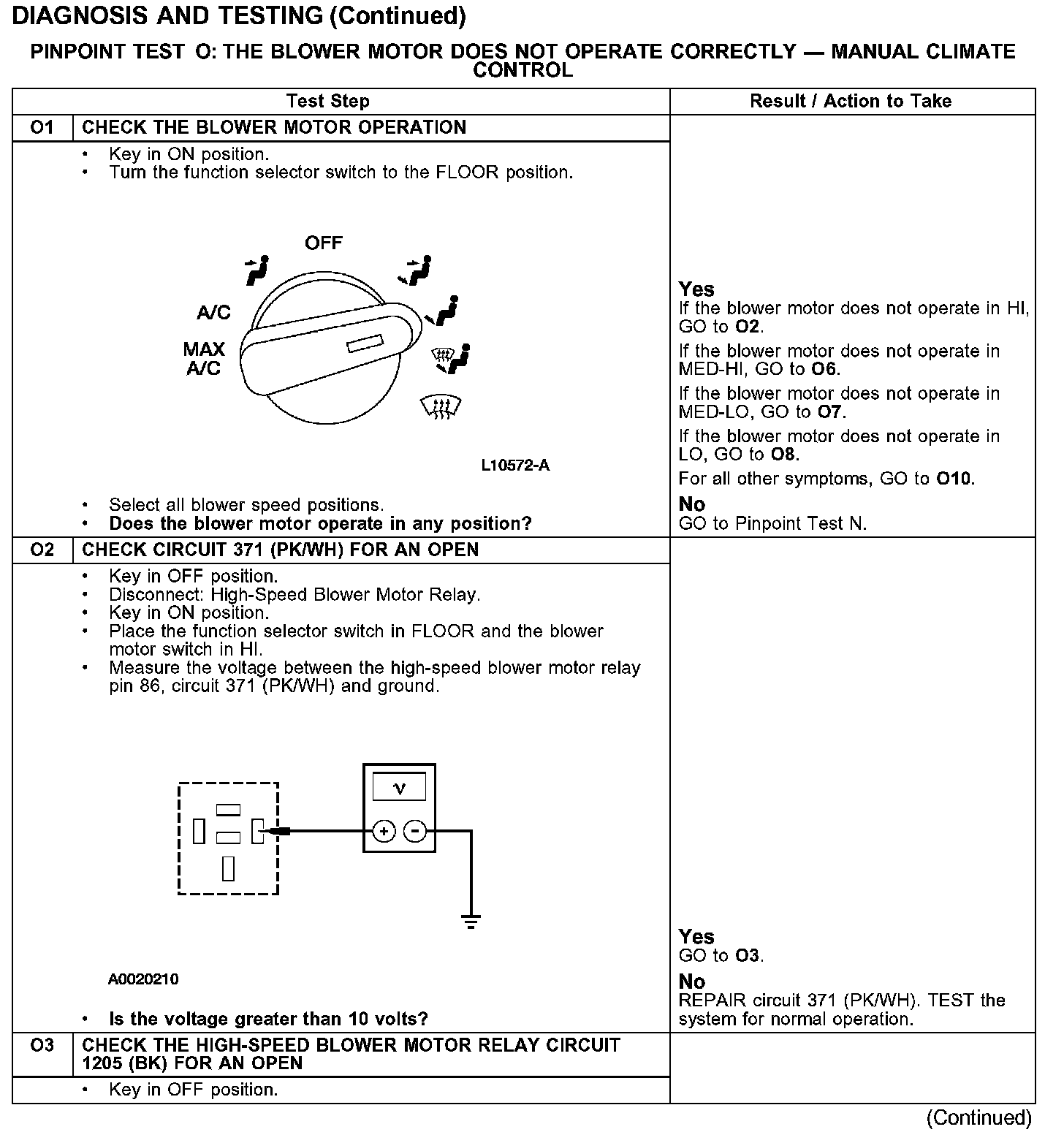 PINPOINT TEST O: THE BLOWER MOTOR DOES NOT OPERATE CORRECTLY - MANUAL CLIMATE CONTROLTest O1-O3: