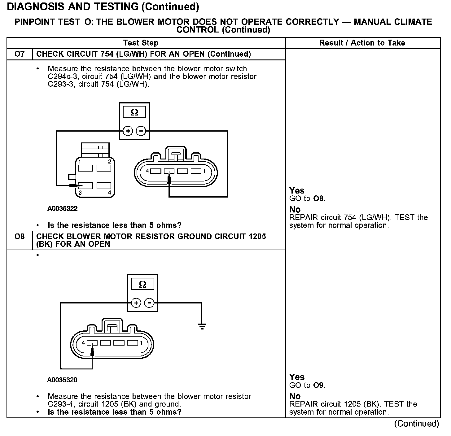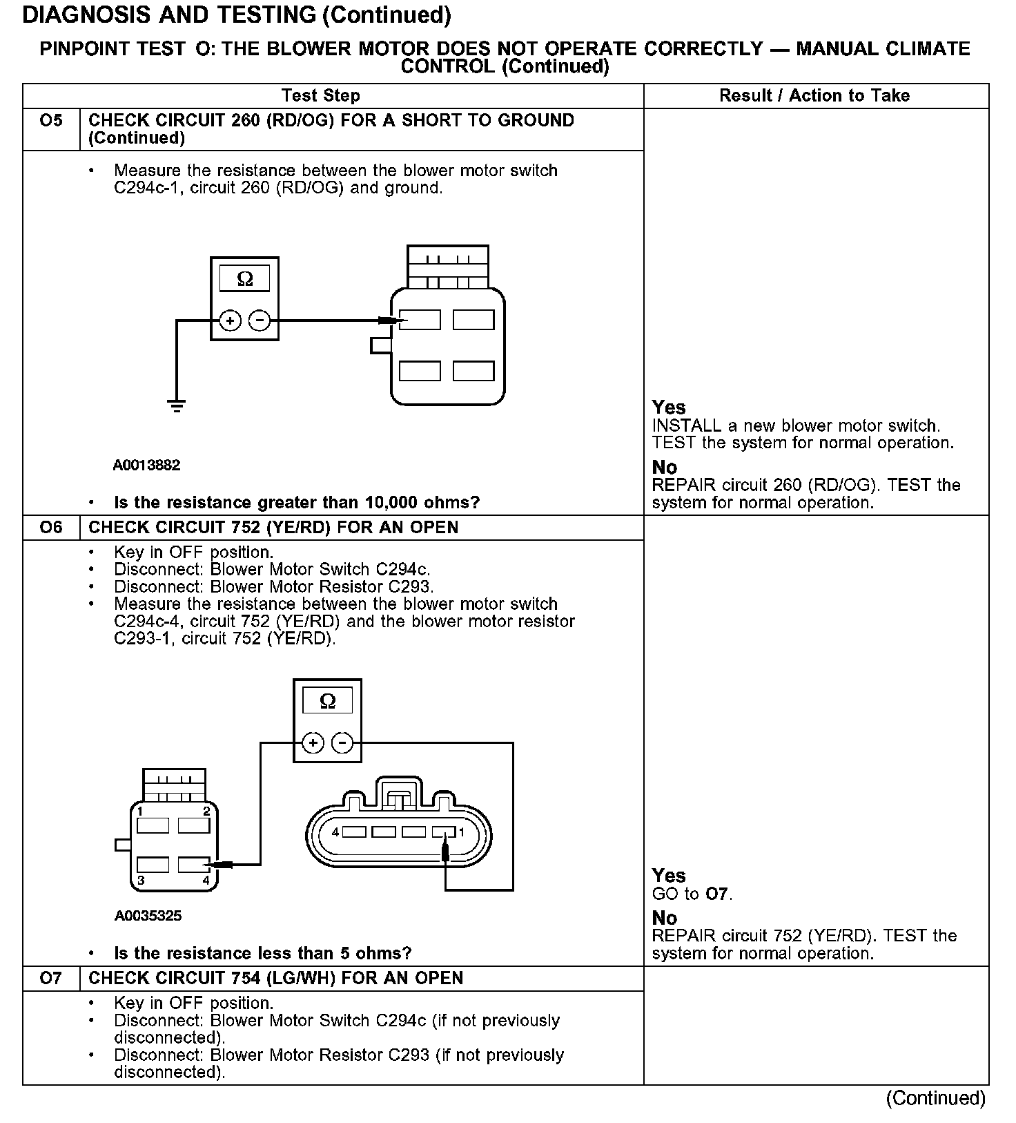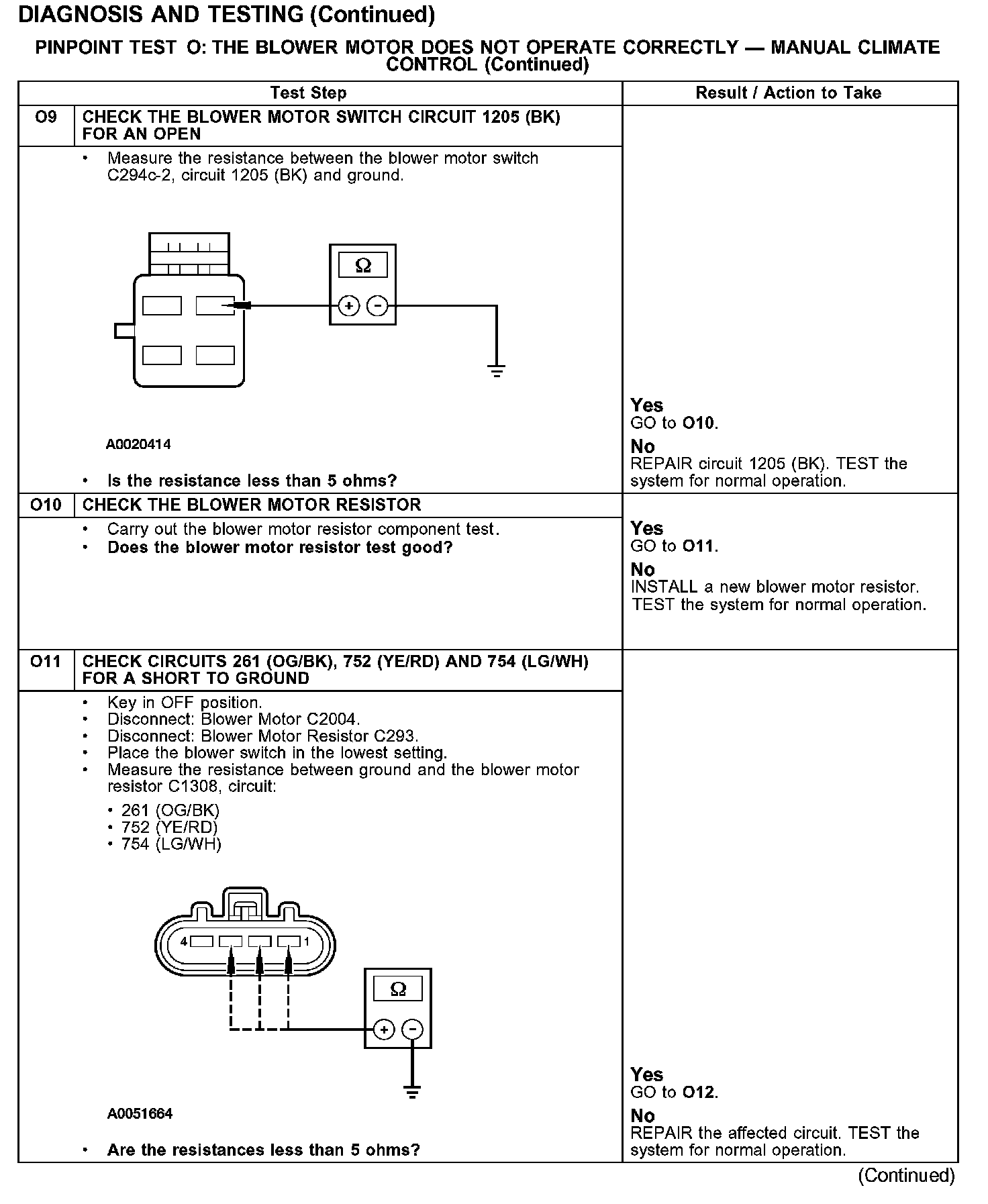 PINPOINT TEST O: THE BLOWER MOTOR DOES NOT OPERATE CORRECTLY - MANUAL CLIMATE CONTROLTest O1-O3:
