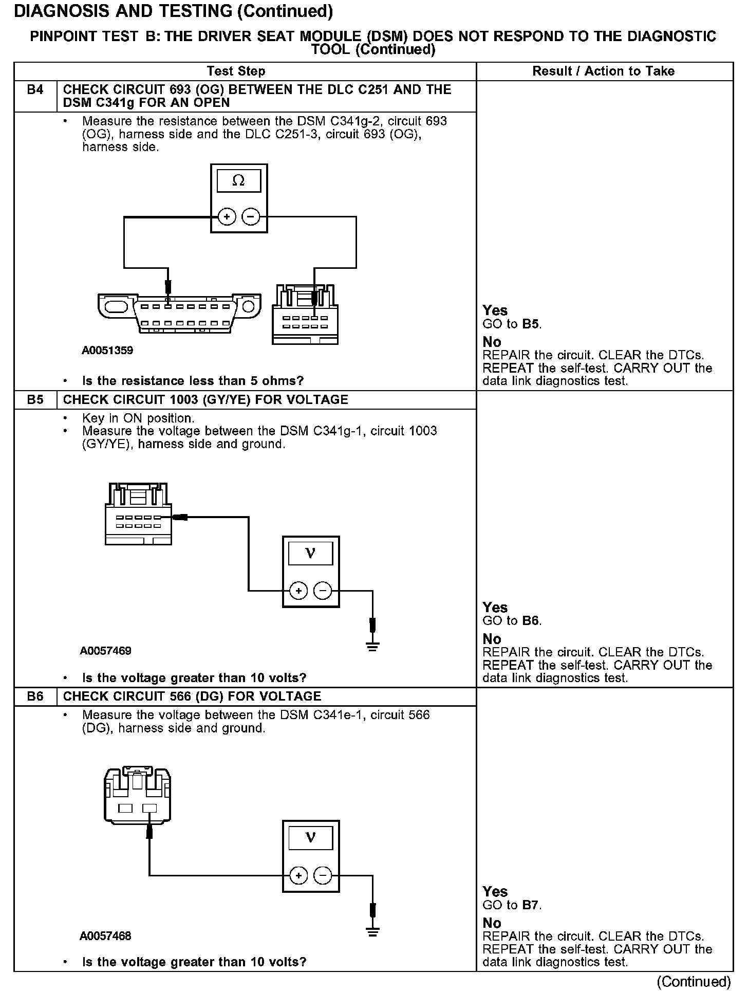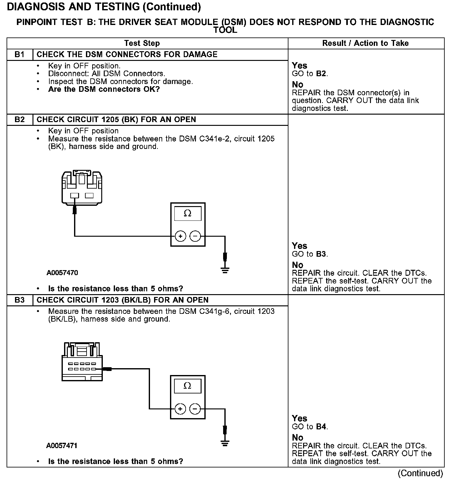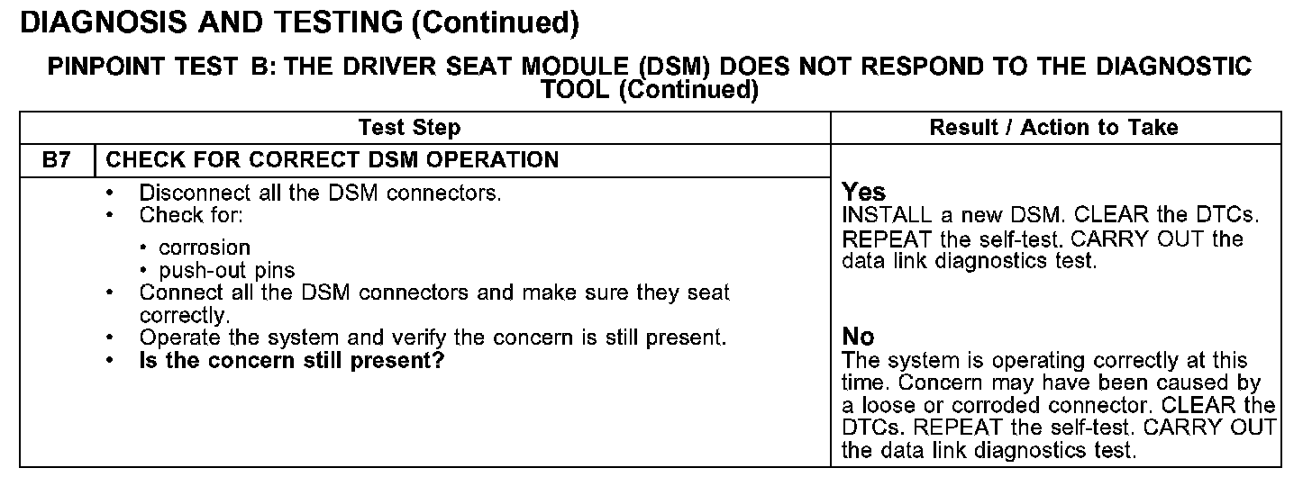PINPOINT TEST B: THE DRIVER SEAT MODULE (DSM) DOES NOT RESPOND TO THE DIAGNOSTIC TOOLTest B1-B3: