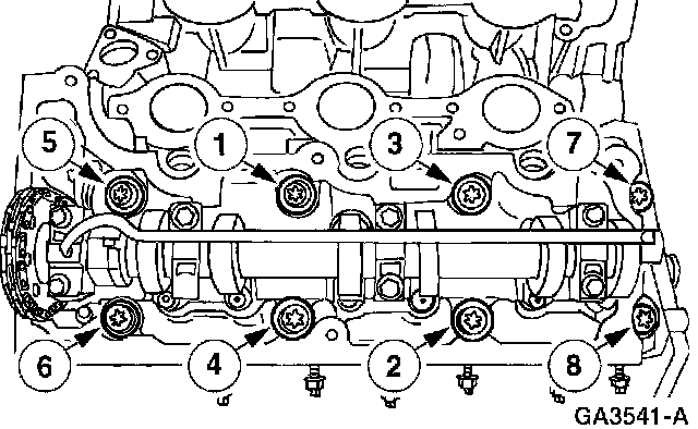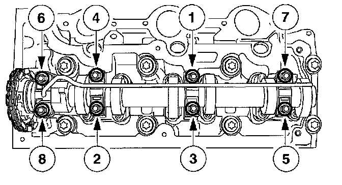 Tighten the camshaft bearing cap bolts in two stages in the sequence shown.
