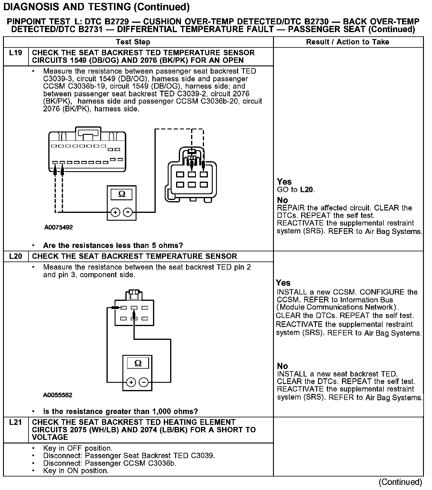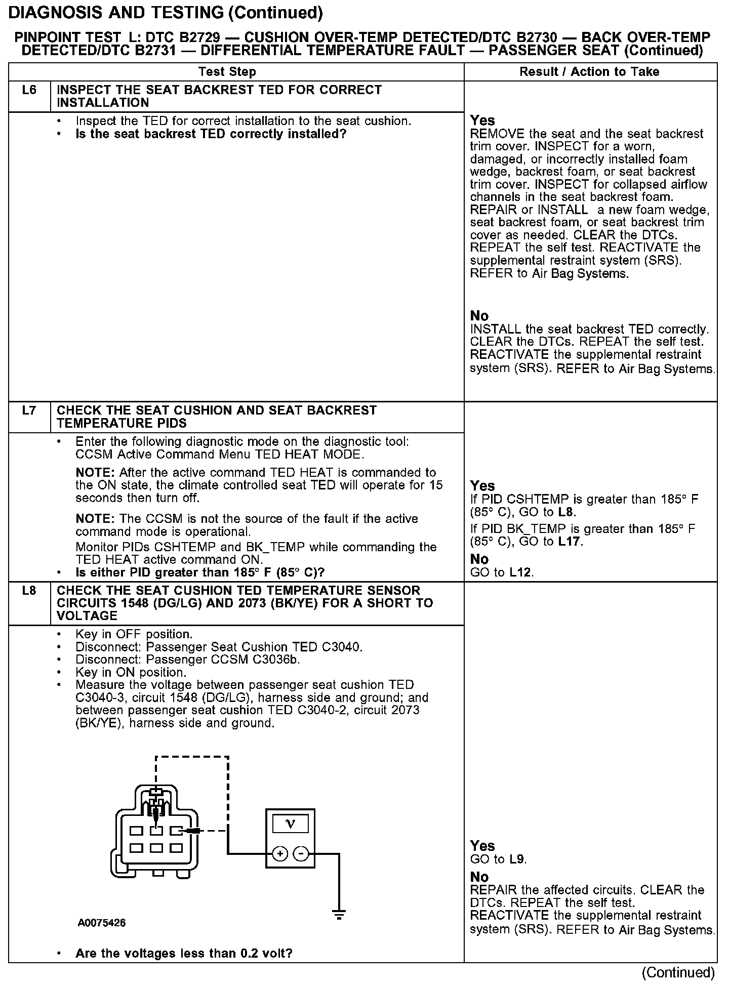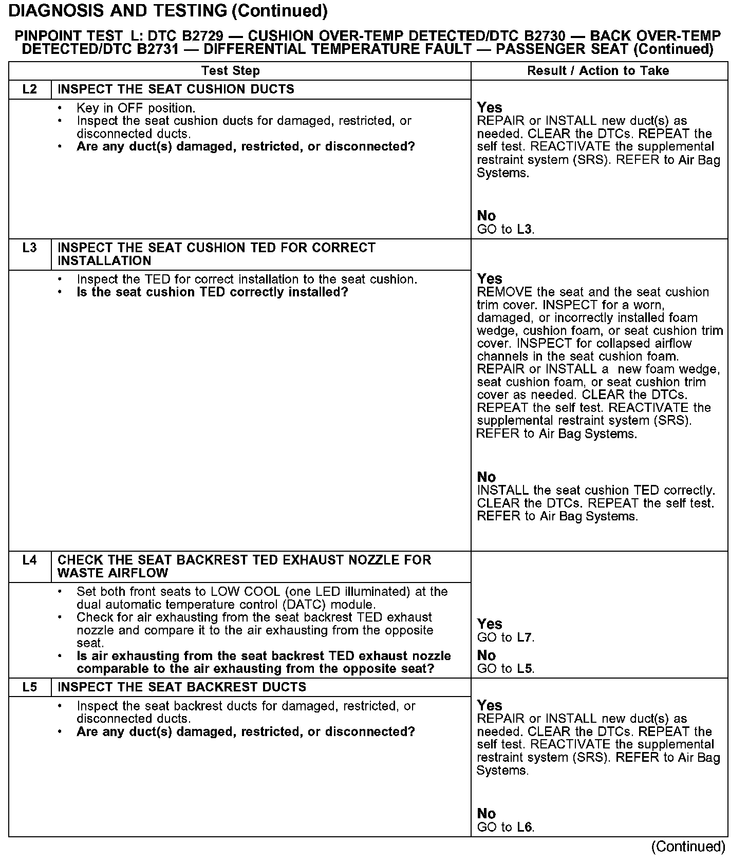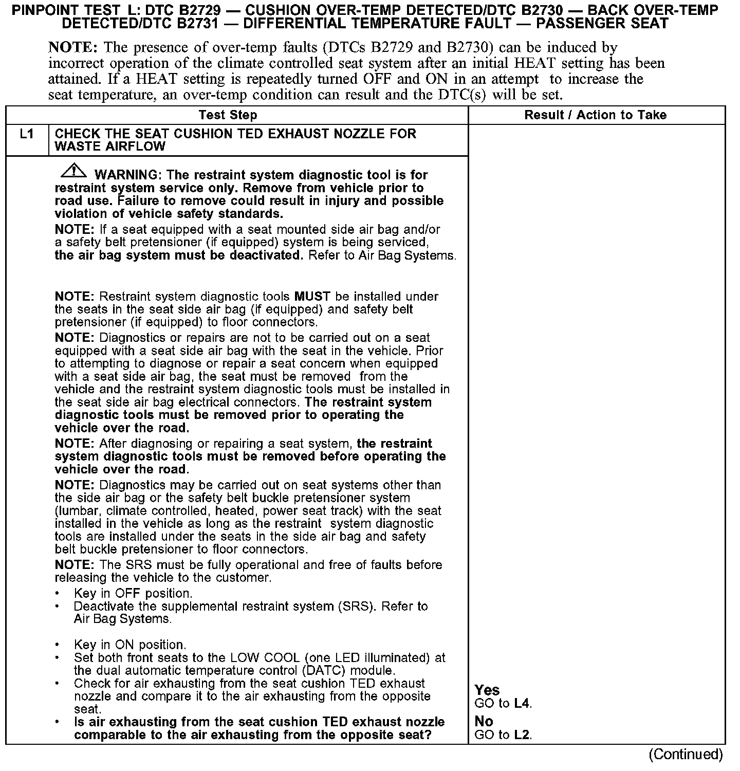 PINPOINT TEST L: DTC B2729 - CUSHION OVER-TEMP DETECTED/DTC B2730 - BACK OVER-TEMP DETECTED/DTC B2731 - DIFFERENTIAL TEMPERATURE FAULT - PASSENGER SEATTest L1: