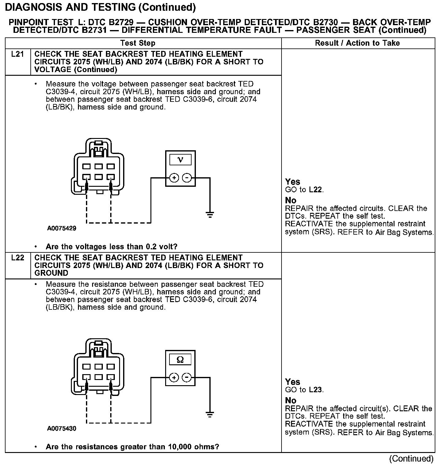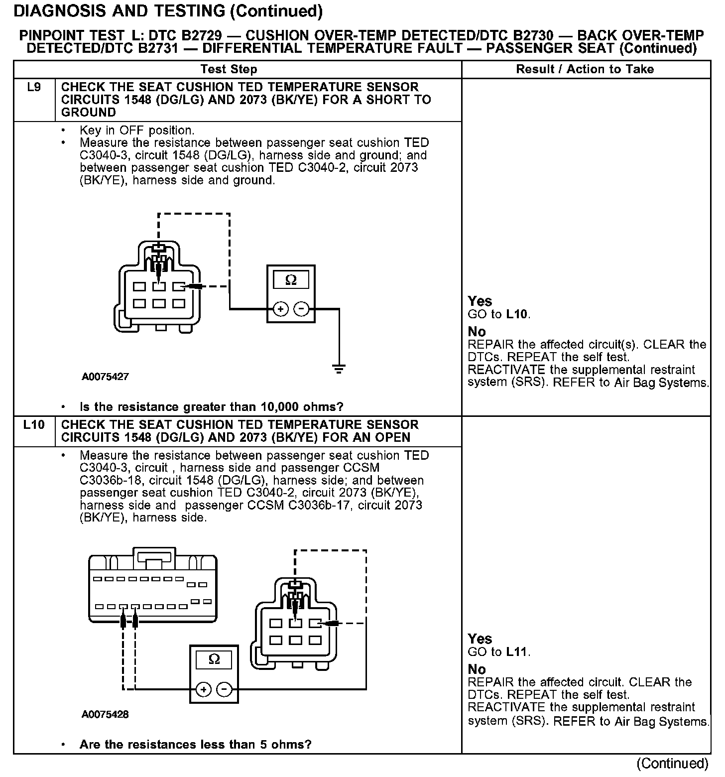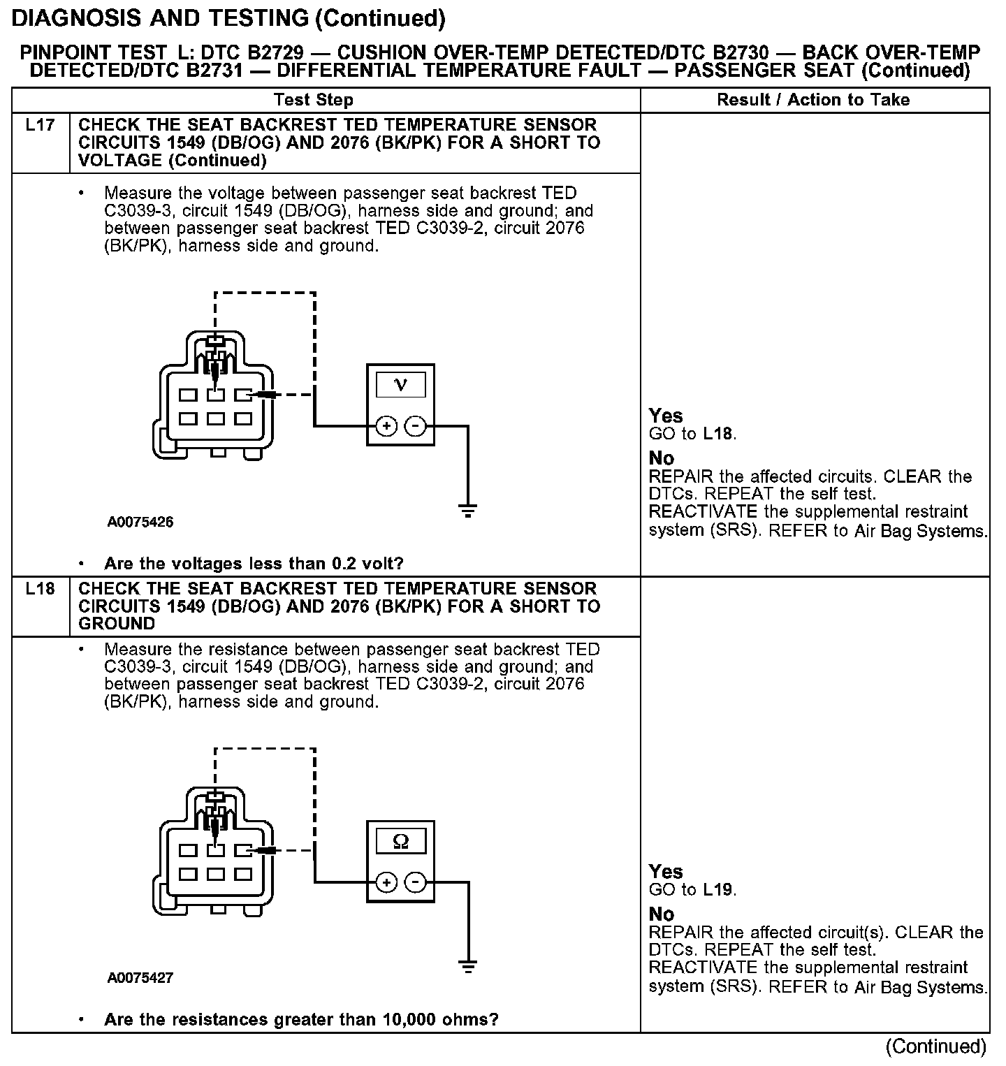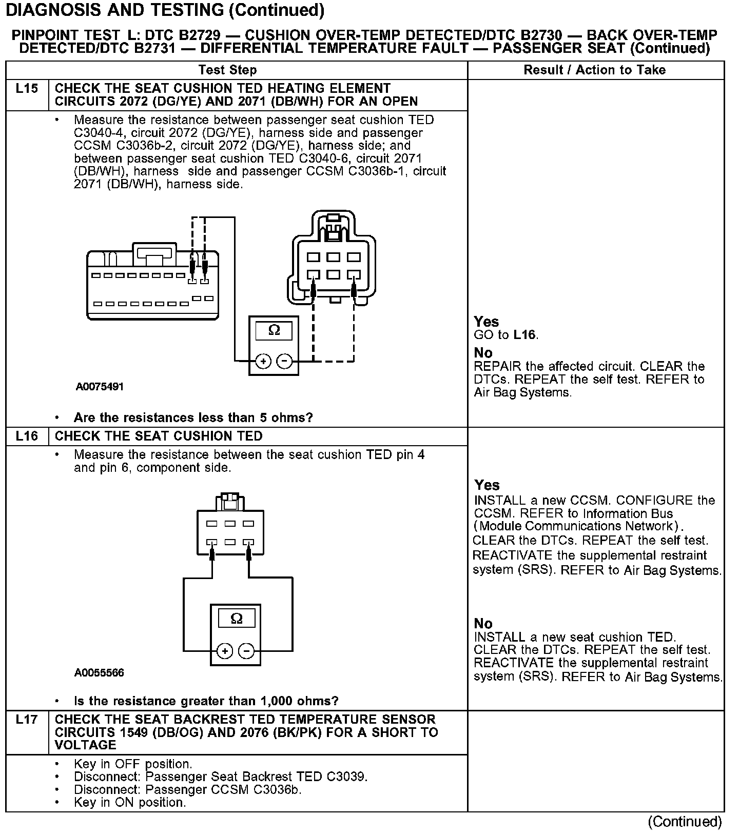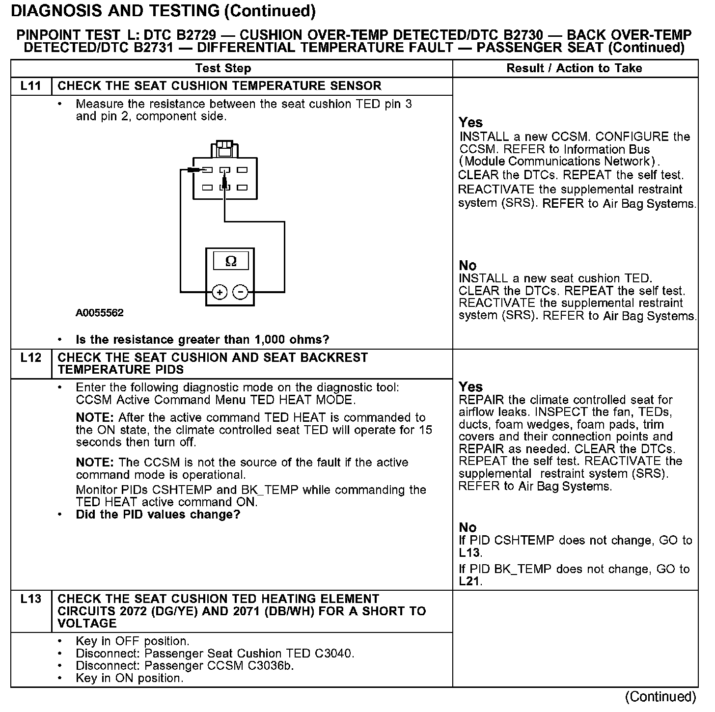 PINPOINT TEST L: DTC B2729 - CUSHION OVER-TEMP DETECTED/DTC B2730 - BACK OVER-TEMP DETECTED/DTC B2731 - DIFFERENTIAL TEMPERATURE FAULT - PASSENGER SEATTest L1: