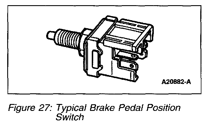 The brake pedal position (BPP) switch (Figure 27) is used by the PCM to disengage the transmission torque converter clutch and on some applications as an input to the idle speed control for idle quality and for vehicle speed control deactivation. Depending on the vehicle application the BPP switch can be connected to the PCM in the following manner: