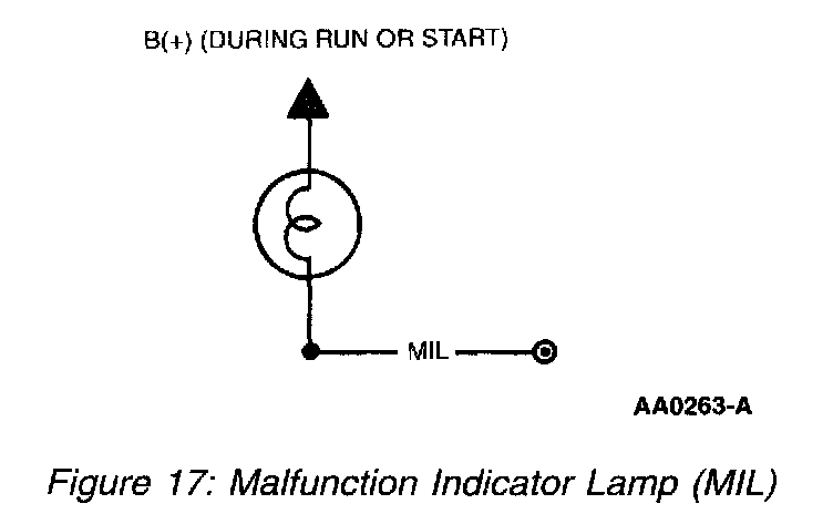 The malfunction indicator lamp (MIL) (Figure 17) alerts the driver that the powertrain control module (PCM) has detected an OBD II emission-related component or system fault. When this occurs, an OBD II Diagnostic Trouble Code (DTC) will be set.