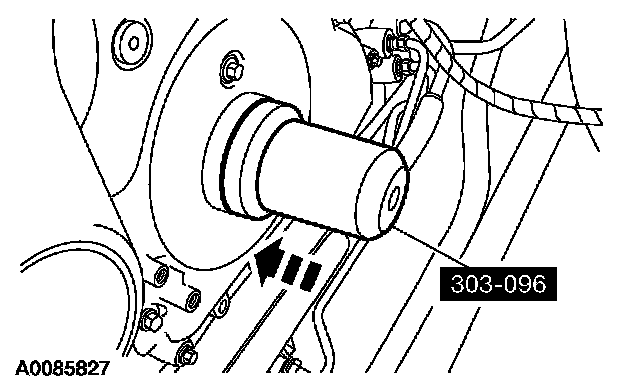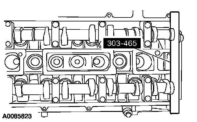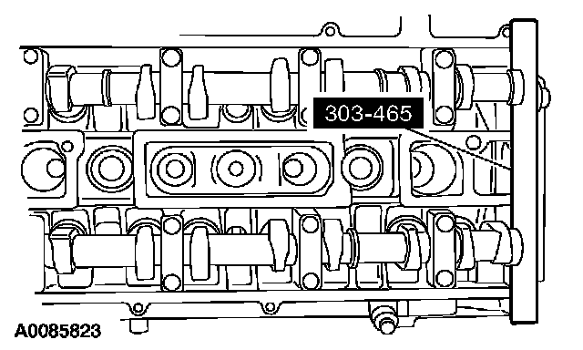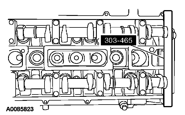 6. CAUTION: The special tool 303-465 is for camshaft alignment only. Using this tool to prevent engine rotation can result in engine damage.