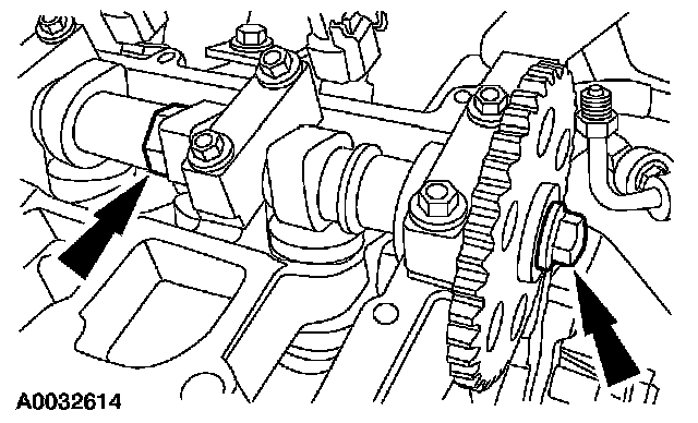^ Use the flats on the camshaft to prevent camshaft rotation.