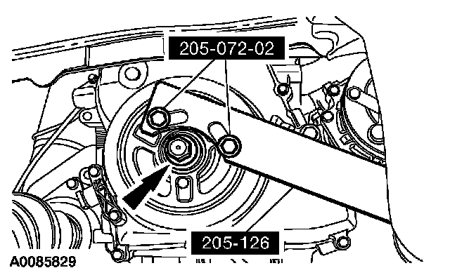CAUTION: Failure to hold the crankshaft pulley in place while tightening the bolt can cause damage to the engine front cover.