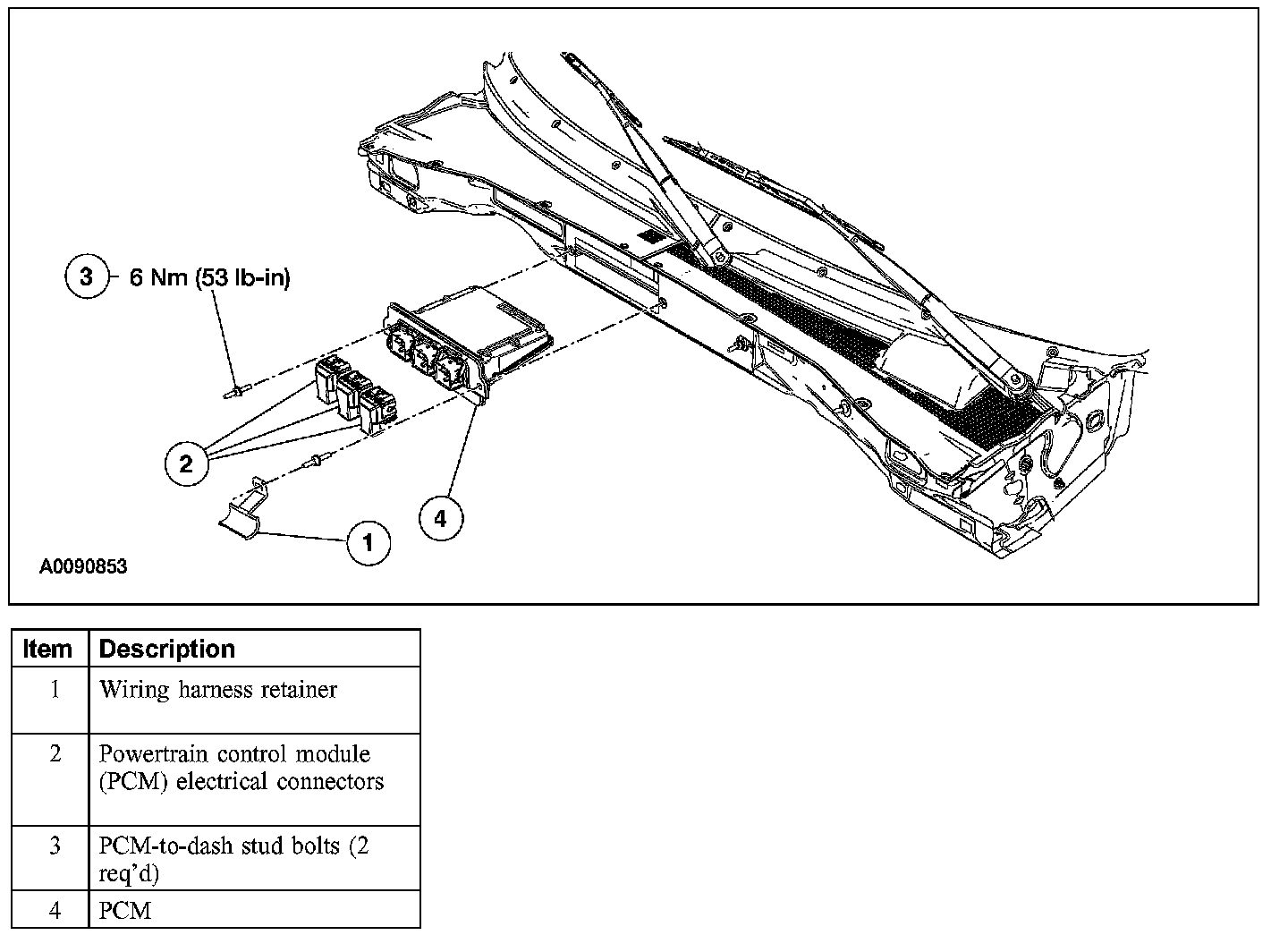 2. Remove the powertrain control module (PCM) stud bolt nut and position the wiring harness aside.