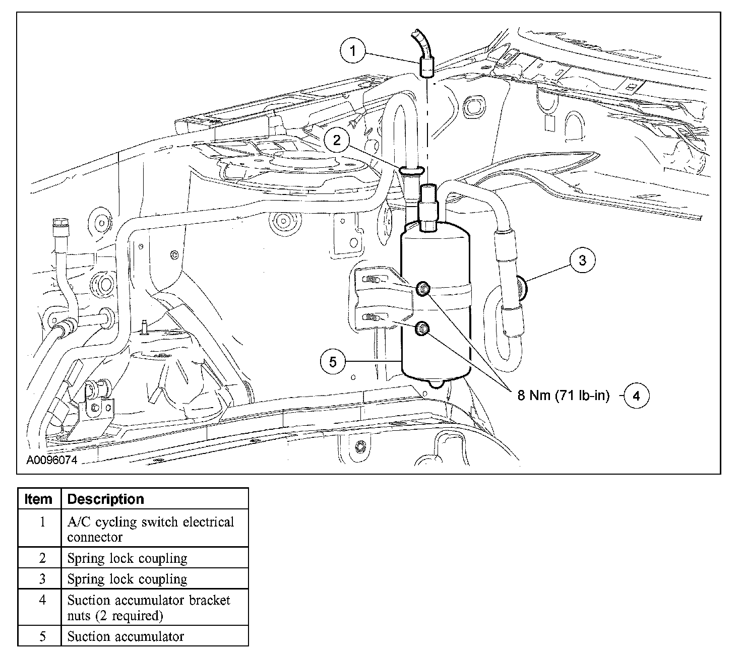 NOTE: Installation of a new suction accumulator is not required when repairing the air conditioning (A/C) system except when there is physical evidence of contamination from a failed A/C compressor or damage to the suction accumulator.