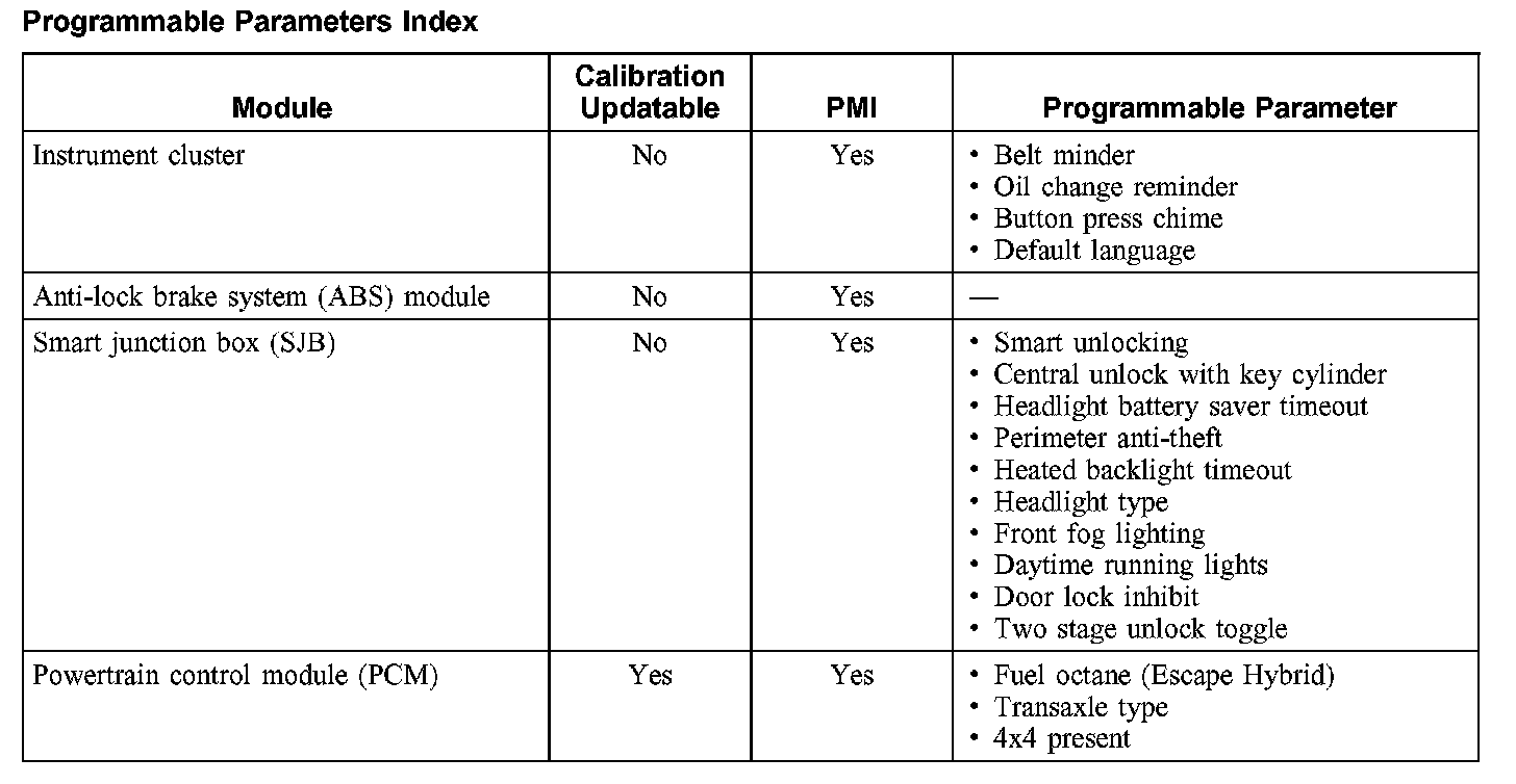 Programmable Parameters Index: