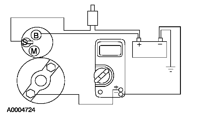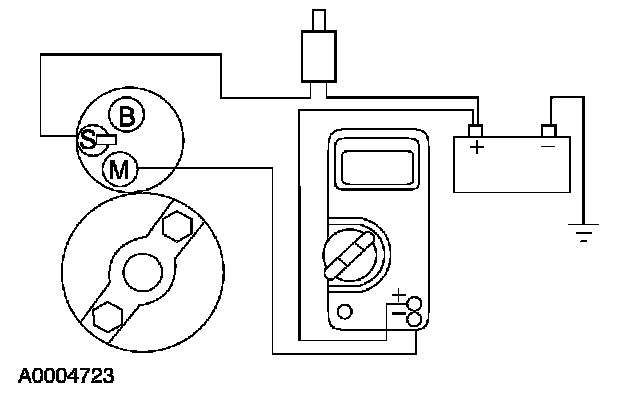 8. Remove the cables from solenoid B-, S- and M-terminals. Clean the cables and connections and reinstall the cables to the correct terminals. Repeat Steps 3 through 6. If the voltage drop reading is still greater than 0.8 volt when checked at the M-terminal and less than 0.8 volt when checked at the B-terminal, the concern is in the solenoid contacts. Install a new starter motor.