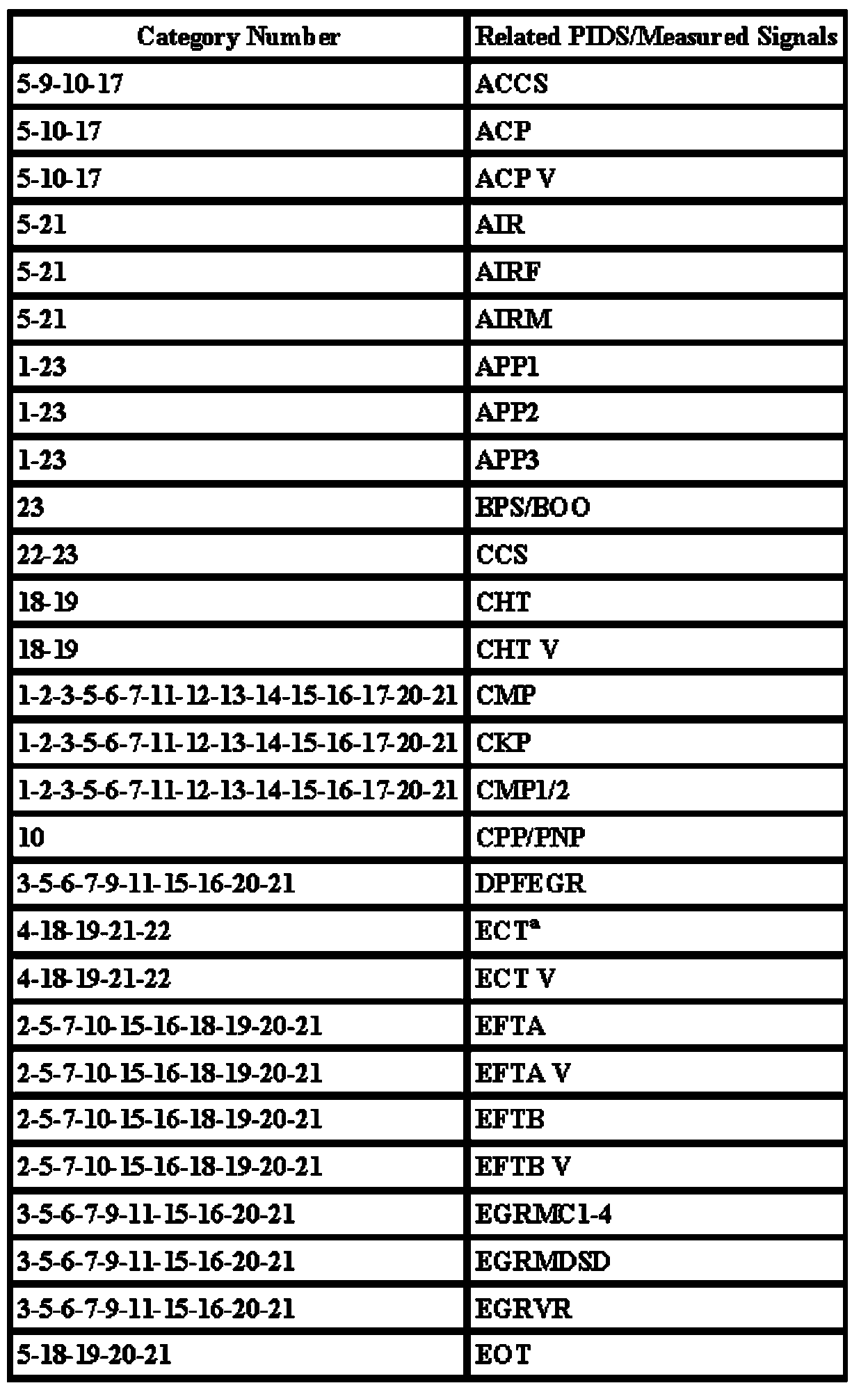 The following listing reflects PIDS and/or measured values which may reveal a possible concern within each system shown. Match the category number with the related PID/measured signal and go to the Typical Diagnostic Reference Value Charts.