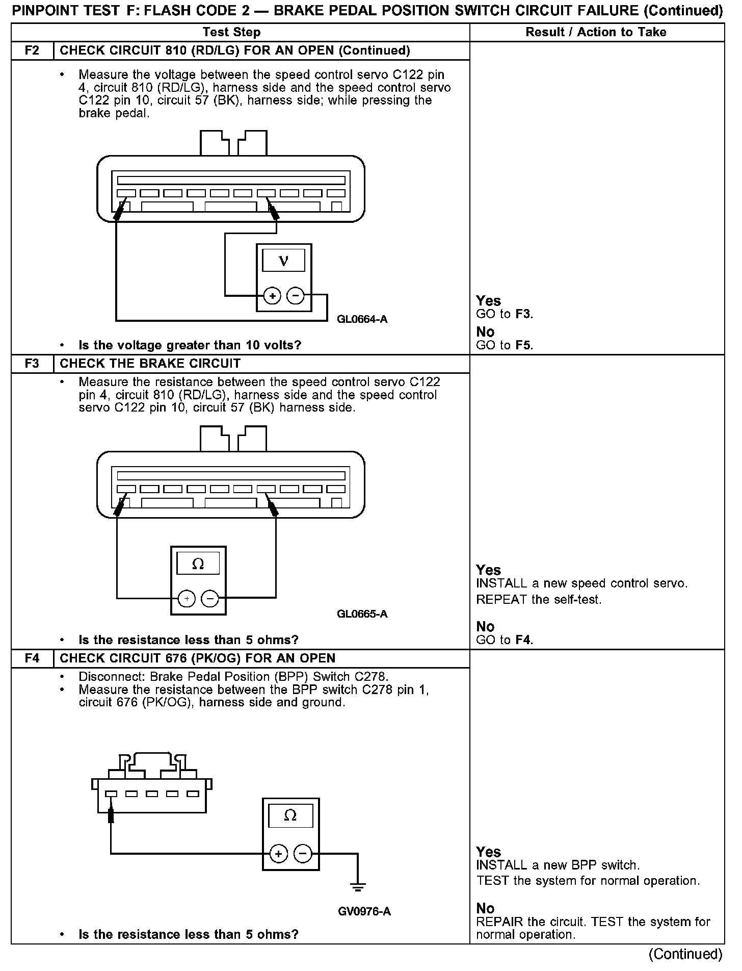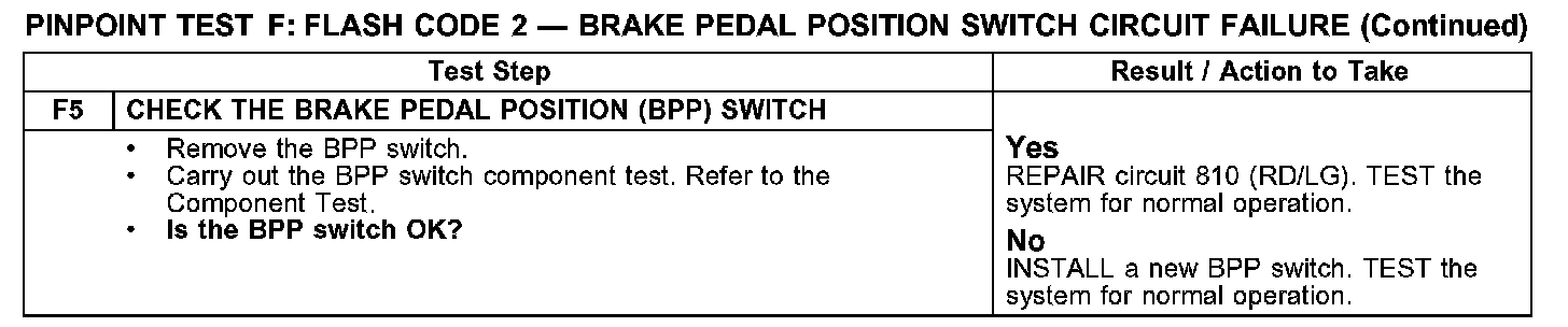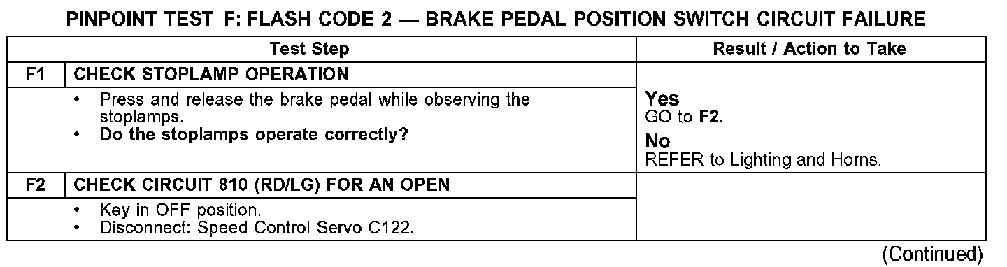 PINPOINT TEST F: FLASH CODE 2 - BRAKE PEDAL POSITION SWITCH CIRCUIT FAILURE