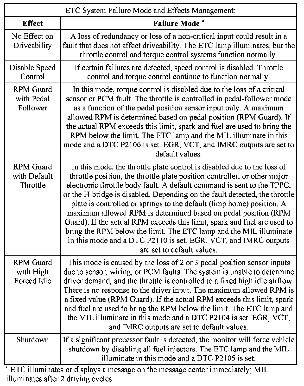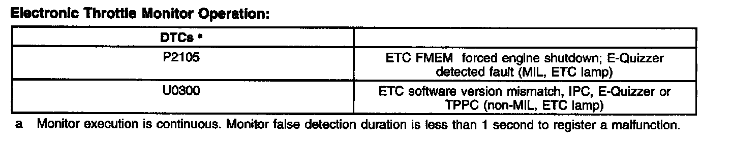 The ETC monitor system is distributed across 2 processors within the PCM: the main powertrain control processor unit (CPU) and a monitoring processor called an enhanced-quizzer (E-Quizzer) processor. The primary monitoring function is carried out by the independent plausibility check (IPC) software, which resides on the main processor. It is responsible for determining the driver-demanded torque and comparing it to an estimate of the actual torque delivered. If the generated torque exceeds driver demand by a specified amount, the IPC takes appropriate corrective action.