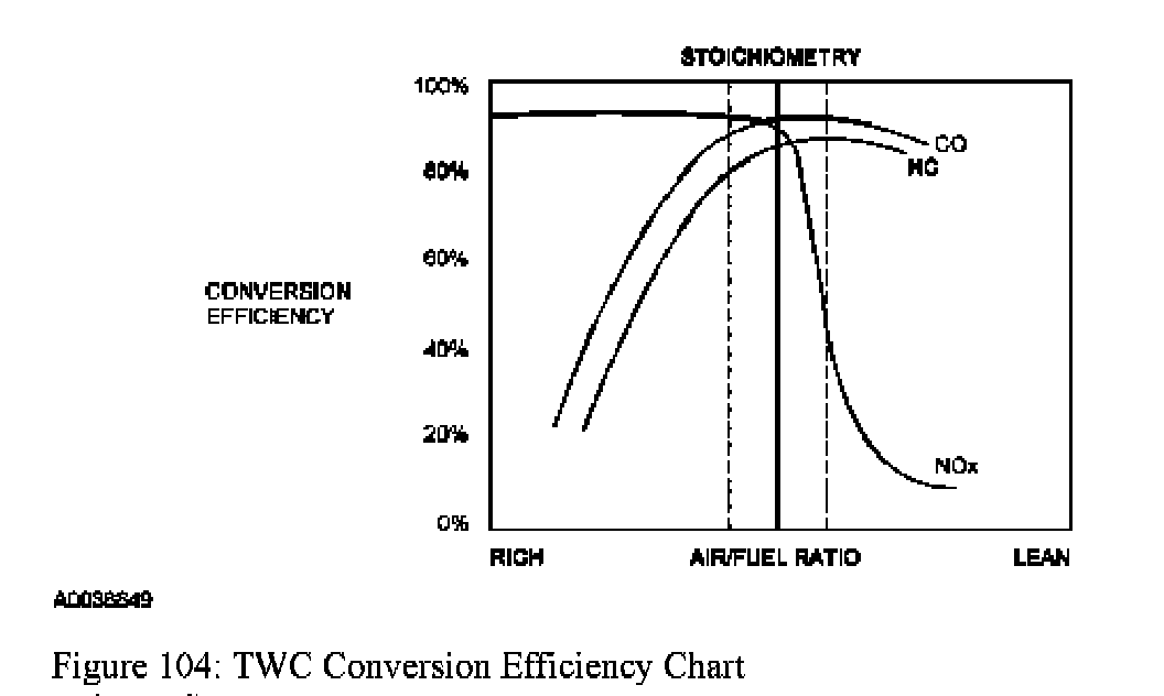 A TWC requires a stoichiometric fuel ratio 14.7 pounds of air to 1 pound of fuel (14.7: 1) for high conversion efficiency. In order to achieve these high efficiencies the air/fuel ratio must be tightly controlled with a narrow window of stoichiometry. Deviations outside of this window will greatly decrease the conversion efficiency. For example a rich mixture will decrease the HC and CO conversion efficiency while a lean mixture will decreases the NO conversion efficiency.