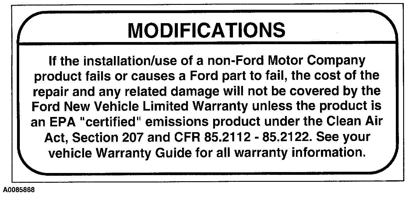 Modifications or additions to the vehicle may cause incorrect operation of the OBD system. Performance modifications that cause a Ford part to fail may not be covered by the Ford New Vehicle Limited Warranty. Burglar alarms, cellular telephones, and CB radios must be carefully installed. Do not install these devices by tapping into or running wires close to powertrain control system wires or components.