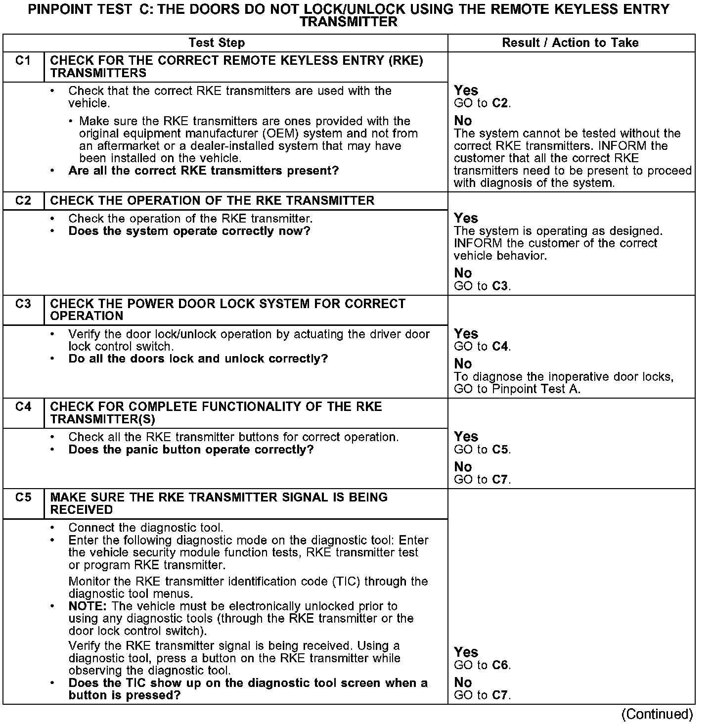 PINPOINT TEST C: THE DOORS DO NOT LOCK/UNLOCK USING THE REMOTE KEYLESS ENTRY TRANSMITTERC1-C5: