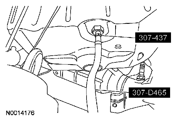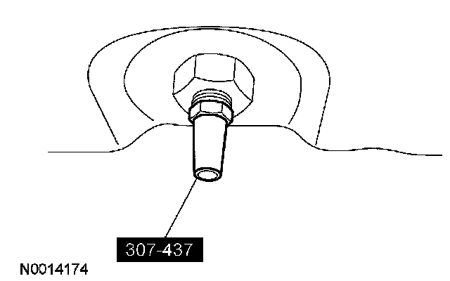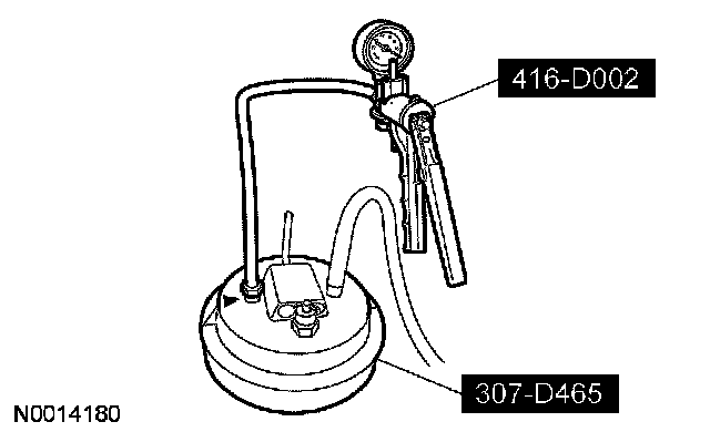 12. Apply a maximum of 206.85 kPa (30 psi) to the open end of the vacuum/pressure hose from the special tool. Fluid will immediately start flowing out of the special tool into the transmission fluid pan.