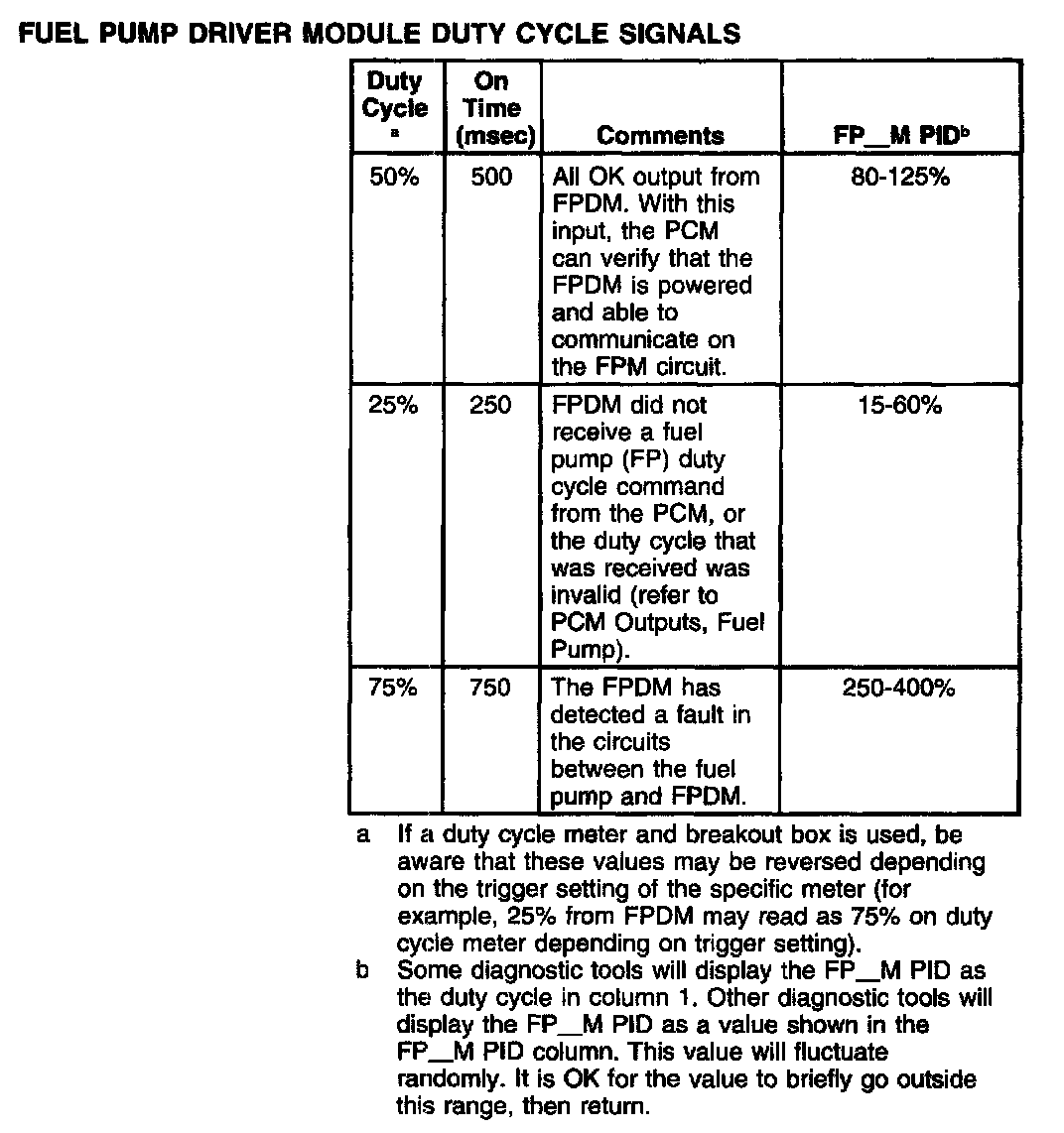 The FPDM communicates diagnostic information to the PCM through the FPM circuit. This information is sent by the FPDM as a duty cycle signal. The 3 duty cycle signals that may be sent are listed in the table.