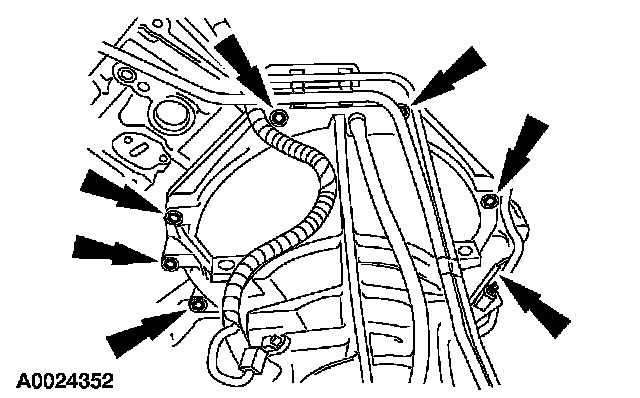 12. Position the fuel line bracket in place and install the 6 engine-to-transmission retaining bolts.