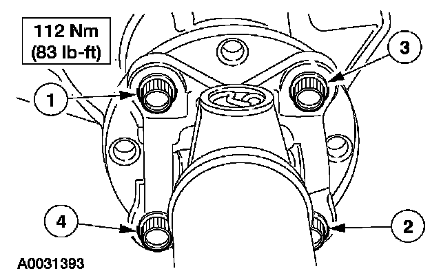 CAUTION: The driveshaft flange fits tightly on the rear axle pinion flange pilot. To make sure that the driveshaft flange seats squarely on the pinion flange, tighten the bolts evenly in a cross pattern as shown.